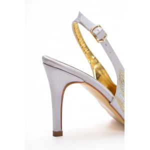 Kadın Gümüş Piko İşlemeli İnce Topuklu Sivri Burunlu Arkası Açık Şık Abiye Stiletto