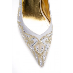 Kadın Altın Piko İşlemeli İnce Topuklu Sivri Burunlu Arkası Açık Şık Abiye Stiletto