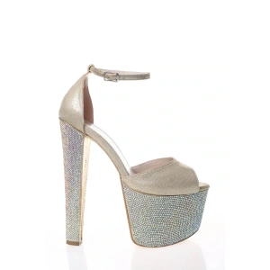Kadın Platin Taşlarla Bezenmiş Yüksek Platform ve Yüksek Topuklu Arkası Kapalı Şık Abiye Ayakkabı