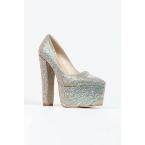 Kadın Platin Komple Taşlarla Bezenmiş Yüksek Platform Kapalı Burunlu Kalın Topuklu Şık Ayakkabı