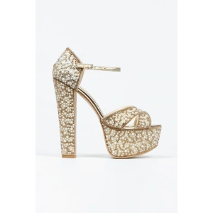 Kadın Altın İnci Taşlı Yüksek Platform Arkası Kapalı Kalın Topuklu Rahat ve Şık Abiye Ayakkabı