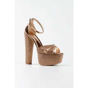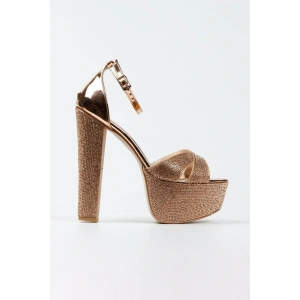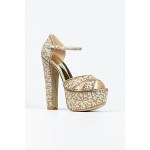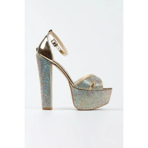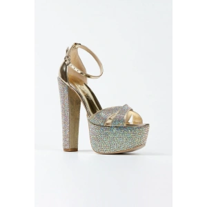 Kadın Altın Damla Taşlı Yüksek Platform Arkası Kapalı Kalın Topuklu Rahat ve Şık Abiye Ayakkabı