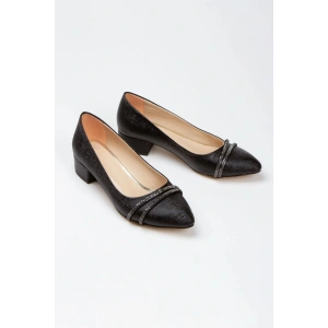 Kadın Siyah Suni Deri Cilt Kalın Topuklu Şık Taş Bağcıklı Rahat Babet