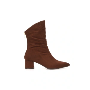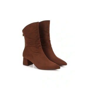 Kadın Kahve Süet Sivri Burunlu Körüklü Kalın Topuklu Arkadan Fermuarlı Rahat ve Şık Bot