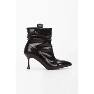 Kadın Siyah Rugan Sivri Burunlu İnce Topuklu Körüklü ve Şık Toka Detaylı Rahat Bot