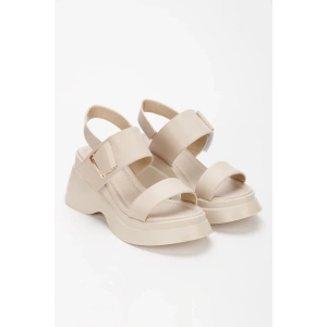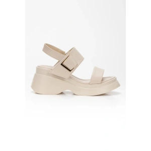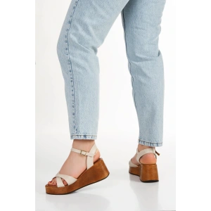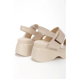 Kadın Bej Suni Deri CiltTek Bant Detaylı Cırt Cırtlı Dolgu Tabanlı Şık Yazlık Ayakkabı