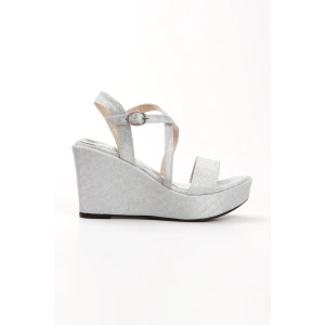 Kadın Gümüş Simli Arka Açık Şık Çapraz Bantlı Dolgu Tabanlı Yazlık Ayakkabı