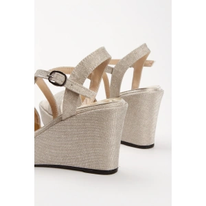 Kadın Platin Simli Arka Açık Şık Çapraz Bantlı Dolgu Tabanlı Yazlık Ayakkabı