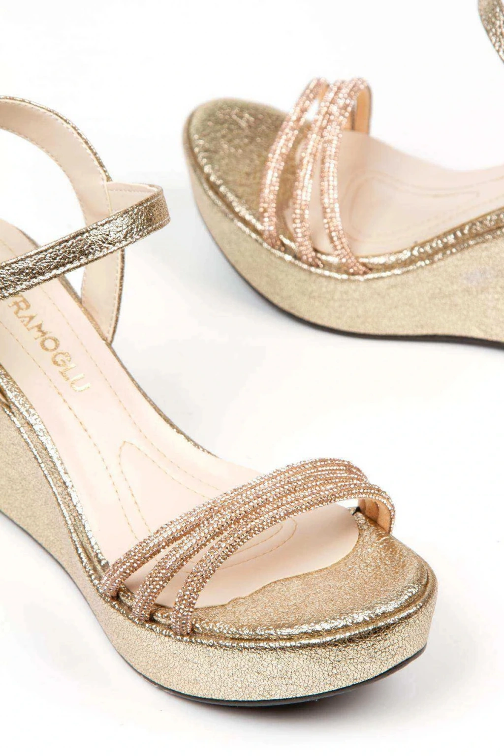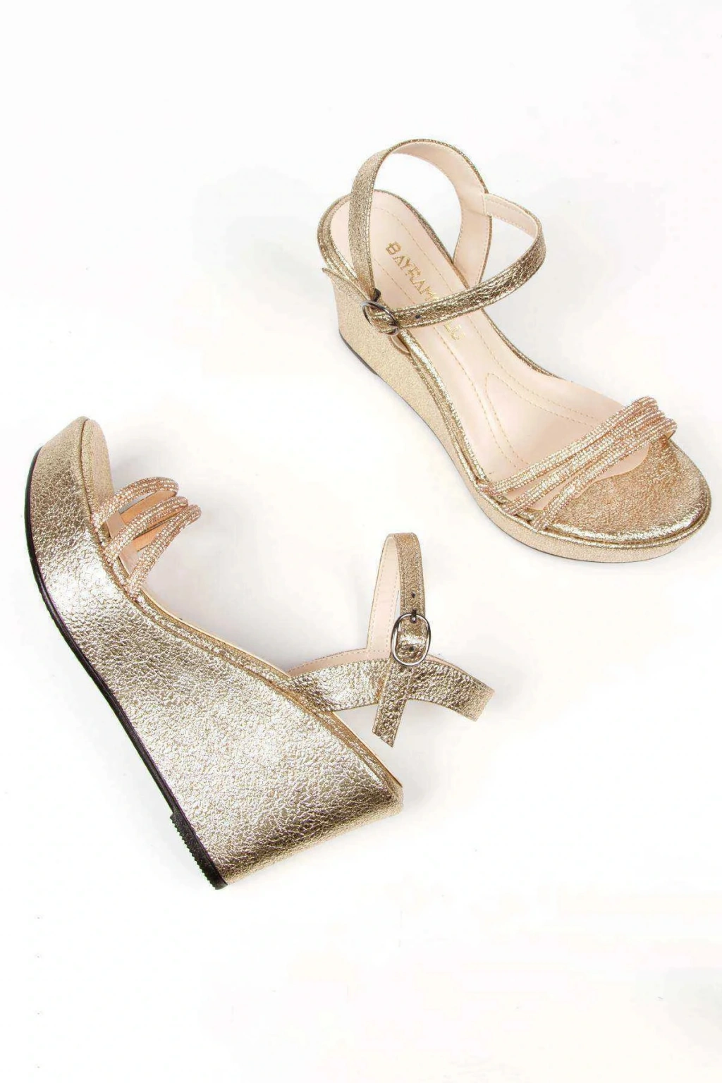 Kadın Altın ( Gold ) Sultan Parlak Damla Taşlı Dolgu Topuklu Rahat Şık Ayakkabı