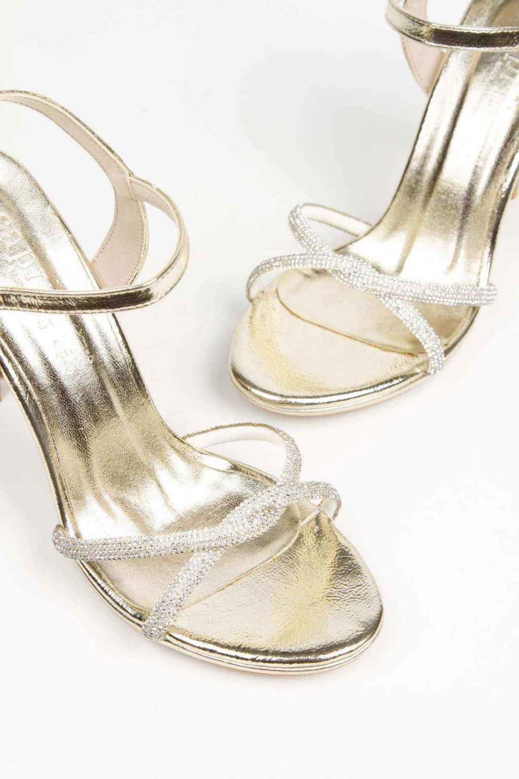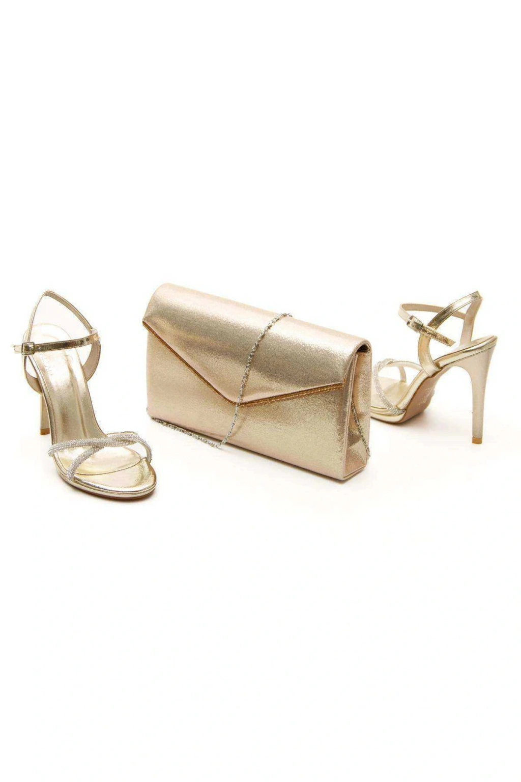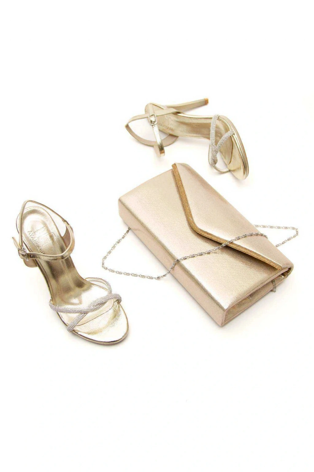 Kadın Altın Kırışık Rugan Parlak Damla Taşlı Platformlu Yazlık Abiye Ayakkabı Ve Şık Çanta Kombini
