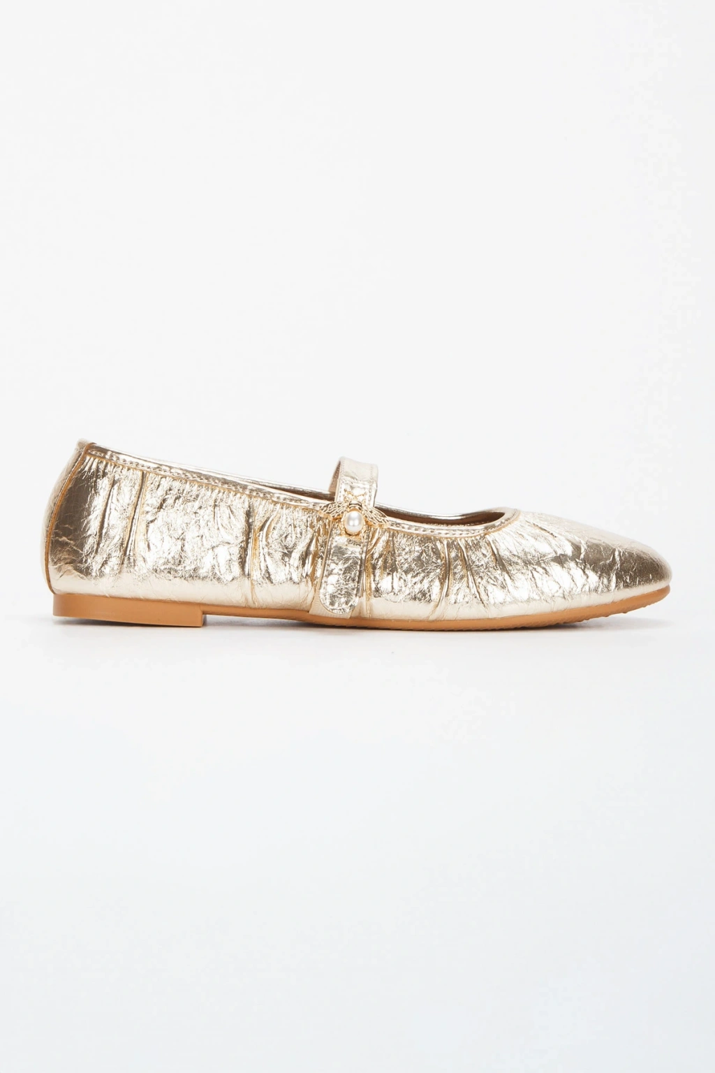 Kadın Altın Pileli Düz Topuklu Şık Toka Detaylı Rahat Babet Ayakkabı