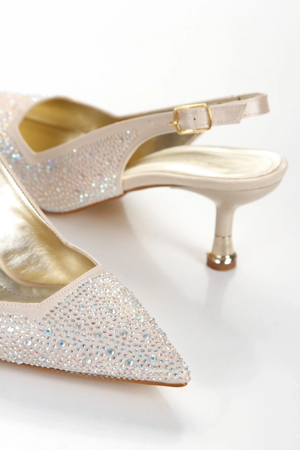 Kadın Altın Saten Damla Taşlarla Bezenmiş 5 cm İnce Galvaniz Topuklu Rahat Stiletto