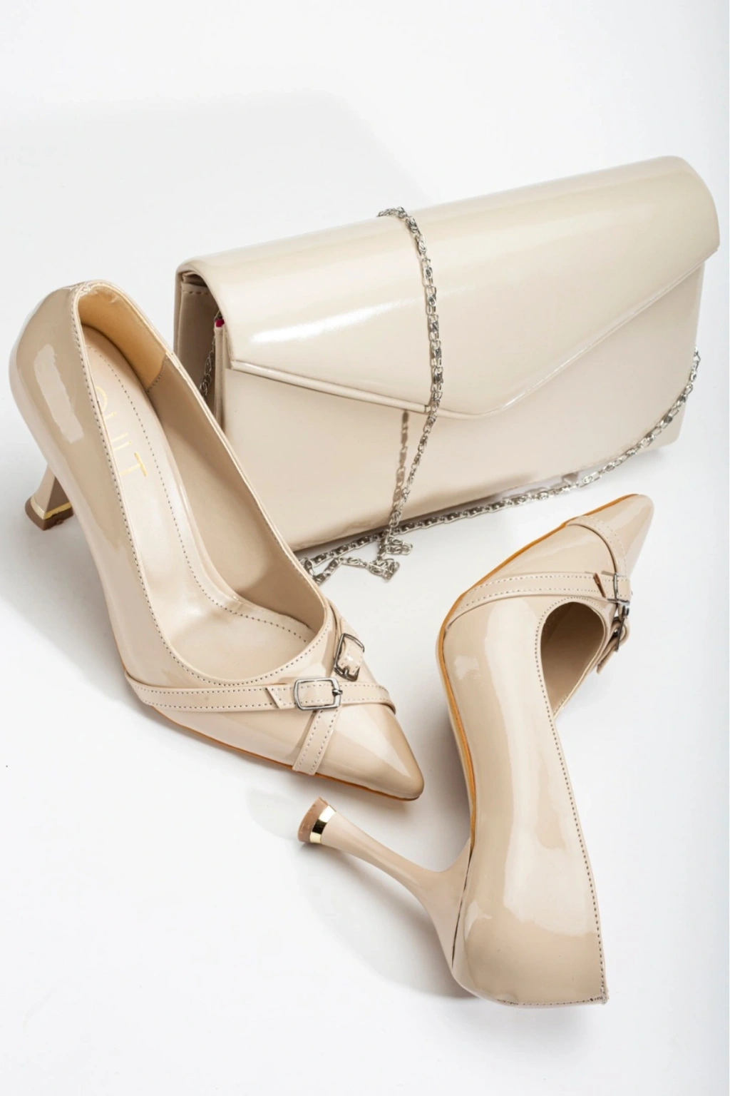 Kadın Bej Şık Tarz Topuklu Çift Toka Detaylı Rahat Stiletto ve Küçük Çanta Kombini