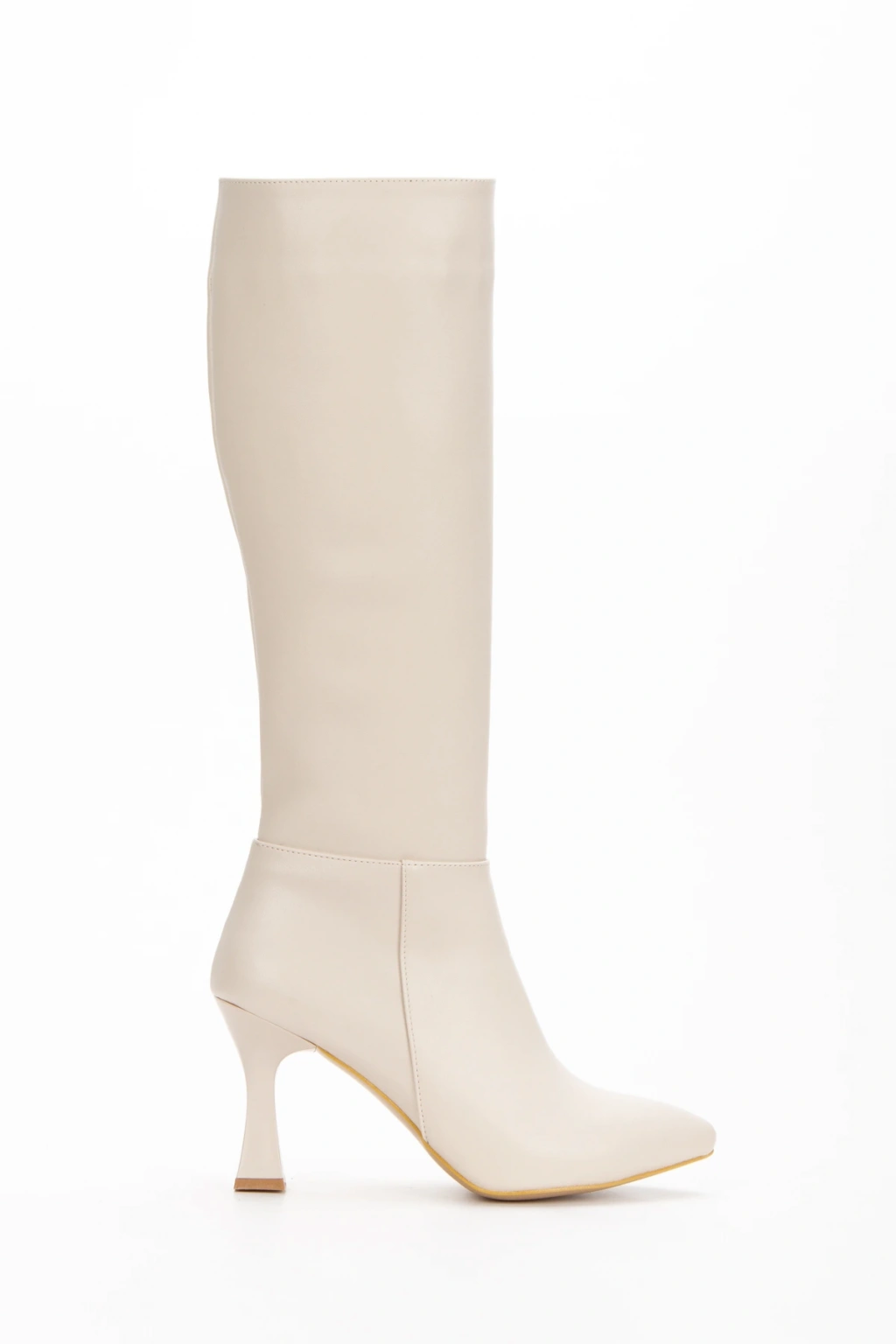 Kadın Bej Suni Deri Cilt Sivri Burunlu İnce Topuklu Rahat Çizme