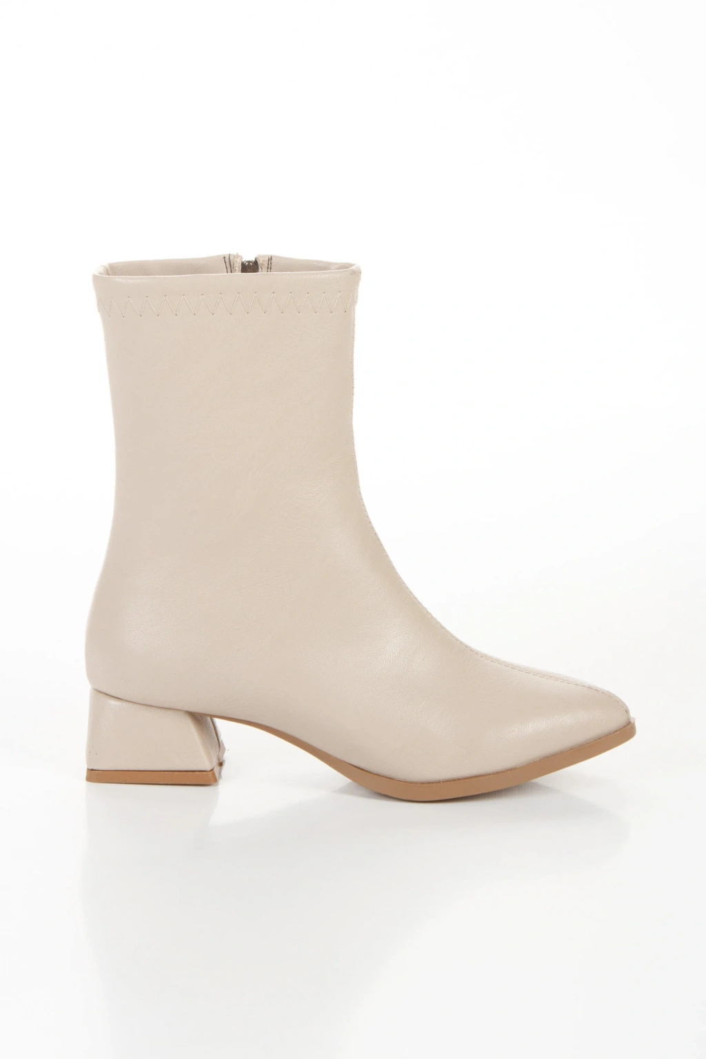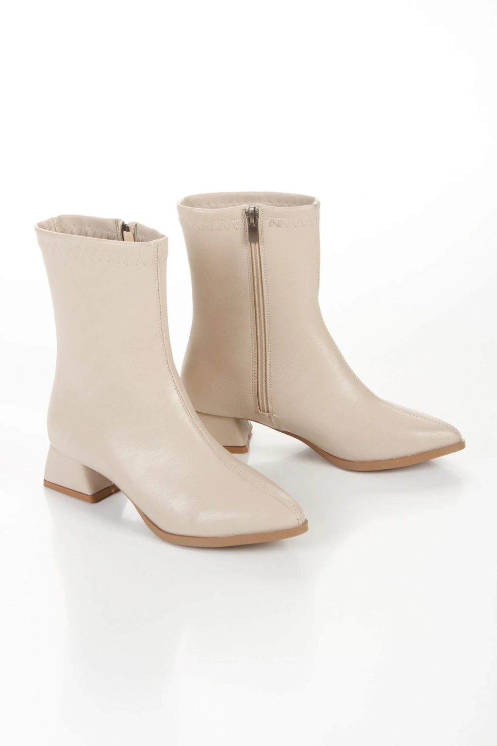 Kadın Bej Suni Deri Cilt Sivri Burunlu Kalın Topuklu Rahat Kışlık Bot