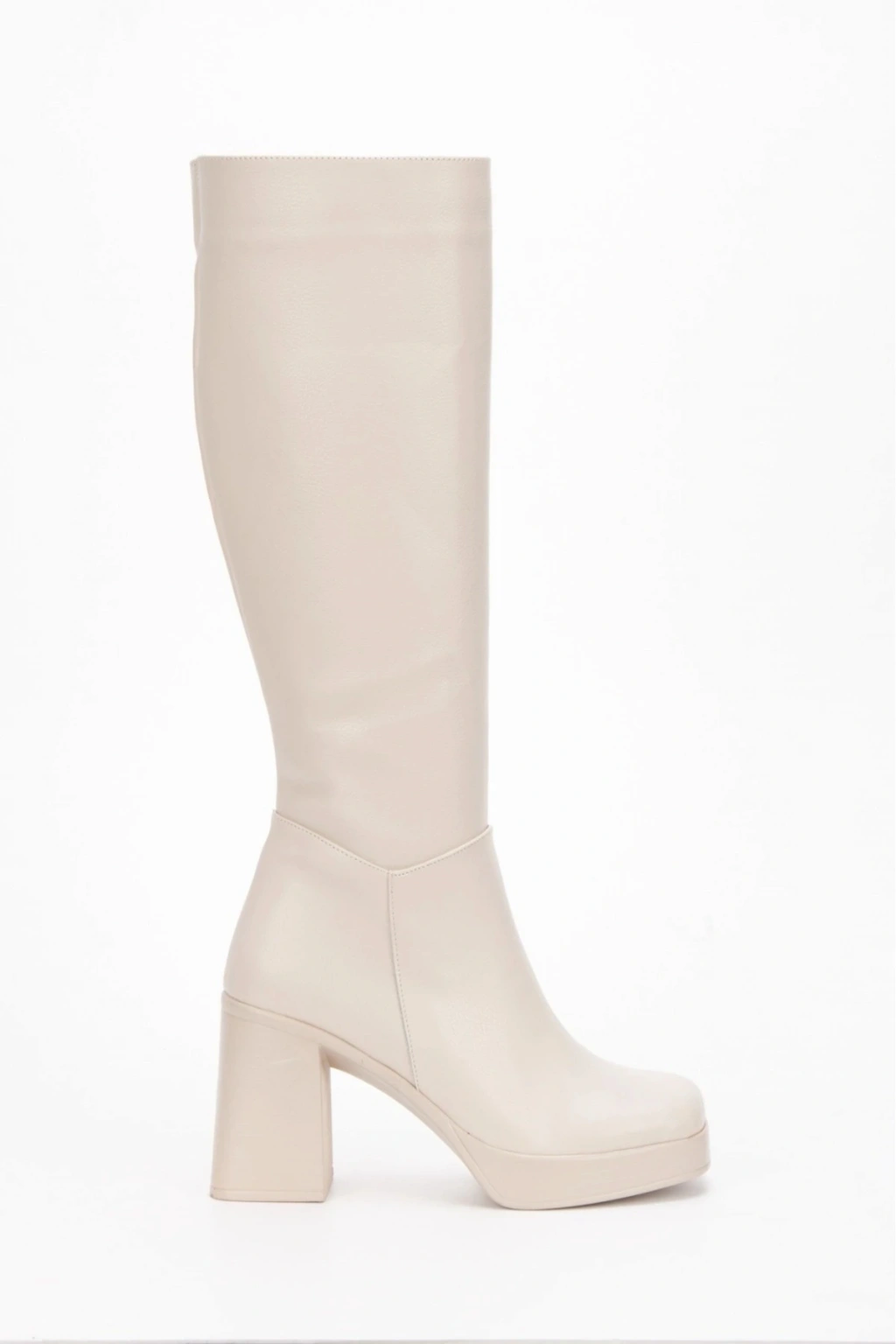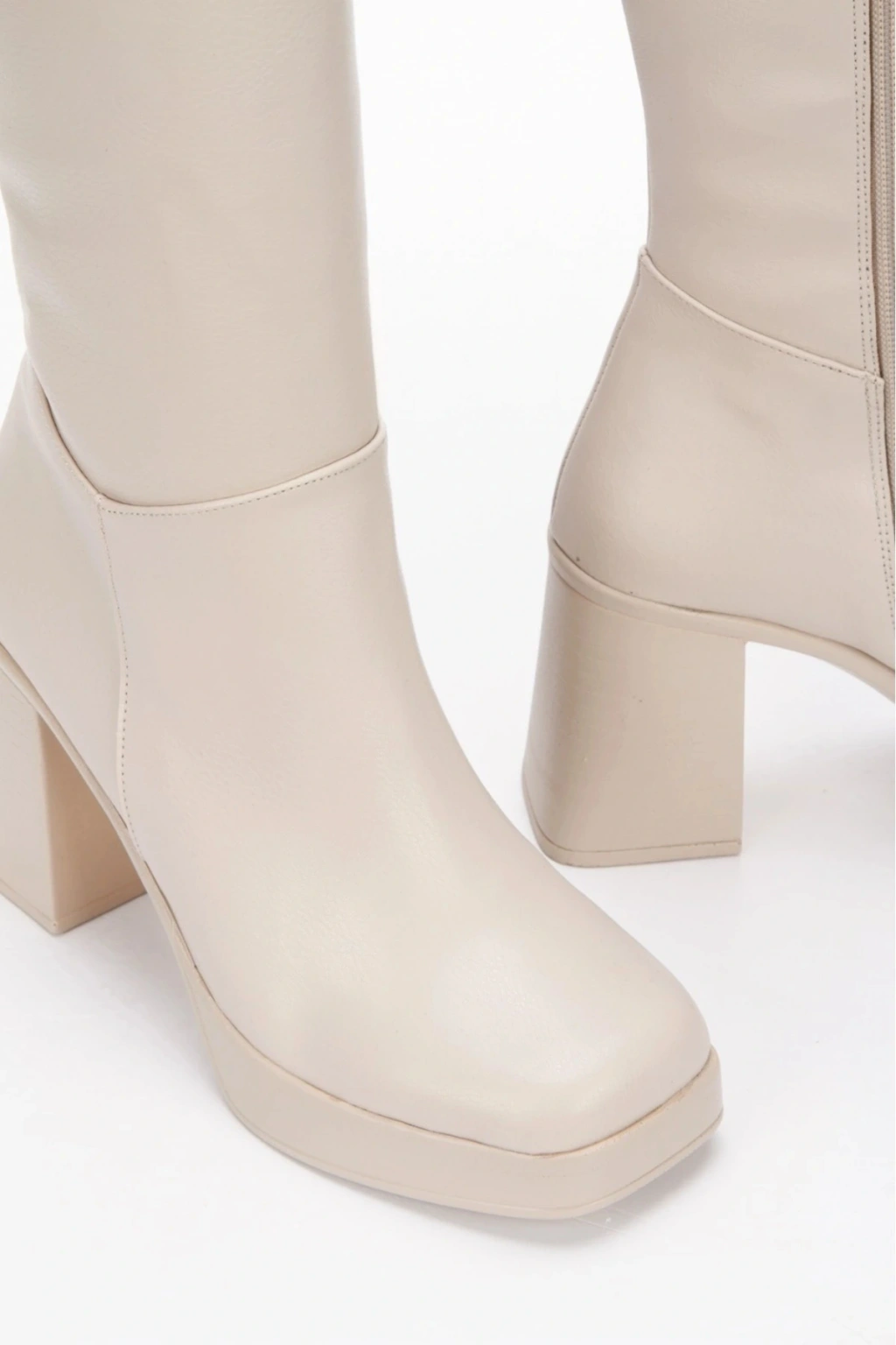 Kadın Bej Suni Deri Cilt Yeni Tarz Küt Burunlu Hafif ve Yüksek Topuklu Düz Şık Rahat Çizme