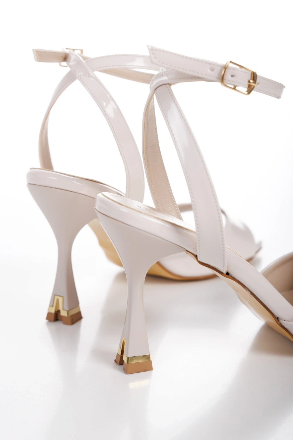 Kadın Bej Tek Bant Şık İkonik Galvaniz Tasarımlı Topuklu Yazlık Ayakkabı ve Çanta Kombini