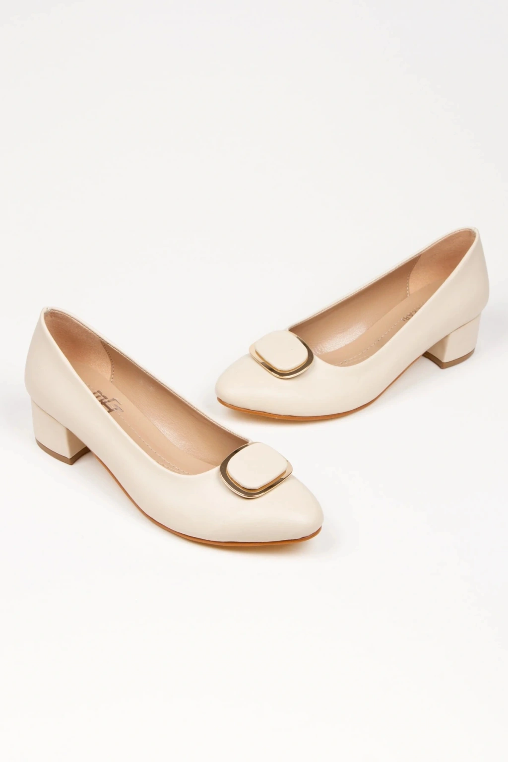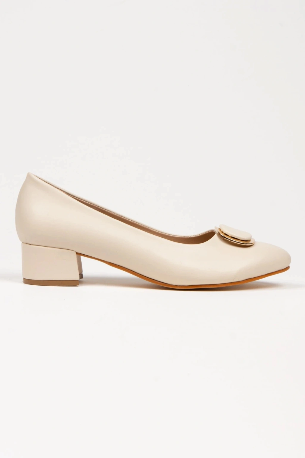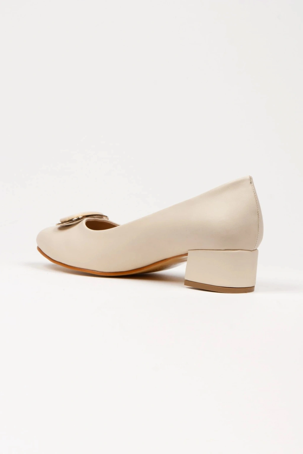 Kadın Bej-ten Suni Deri Cilt Stiletto 3 Cm Kısa Kalın Topuklu Şık Toka Detaylı Rahat Stiletto