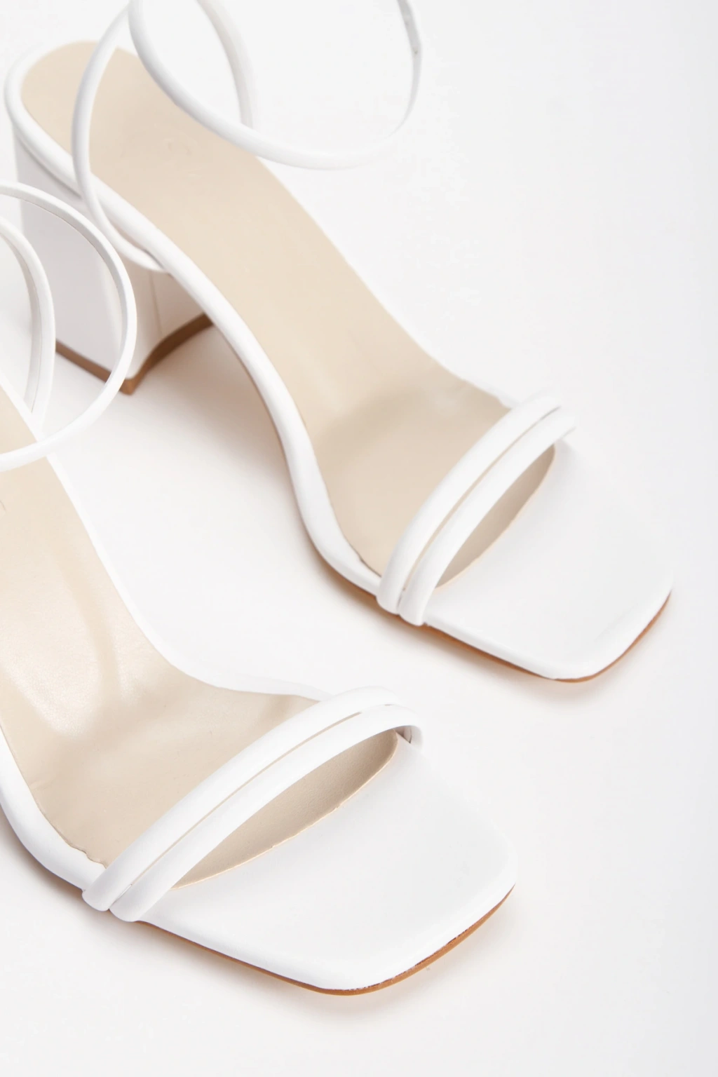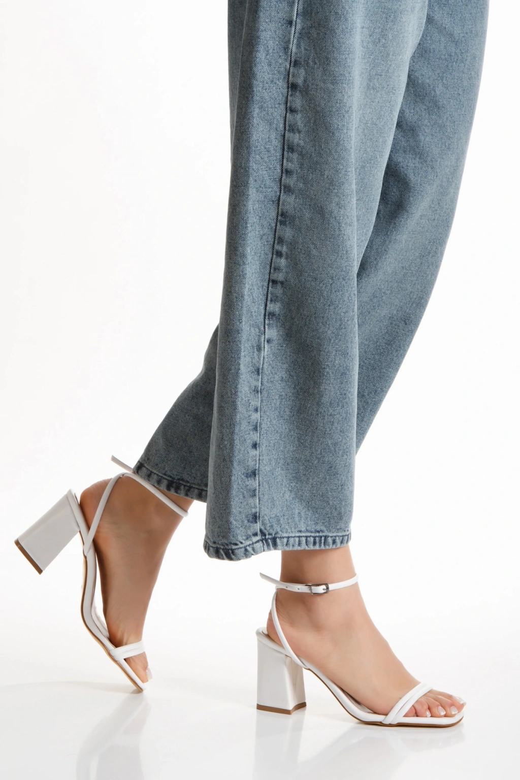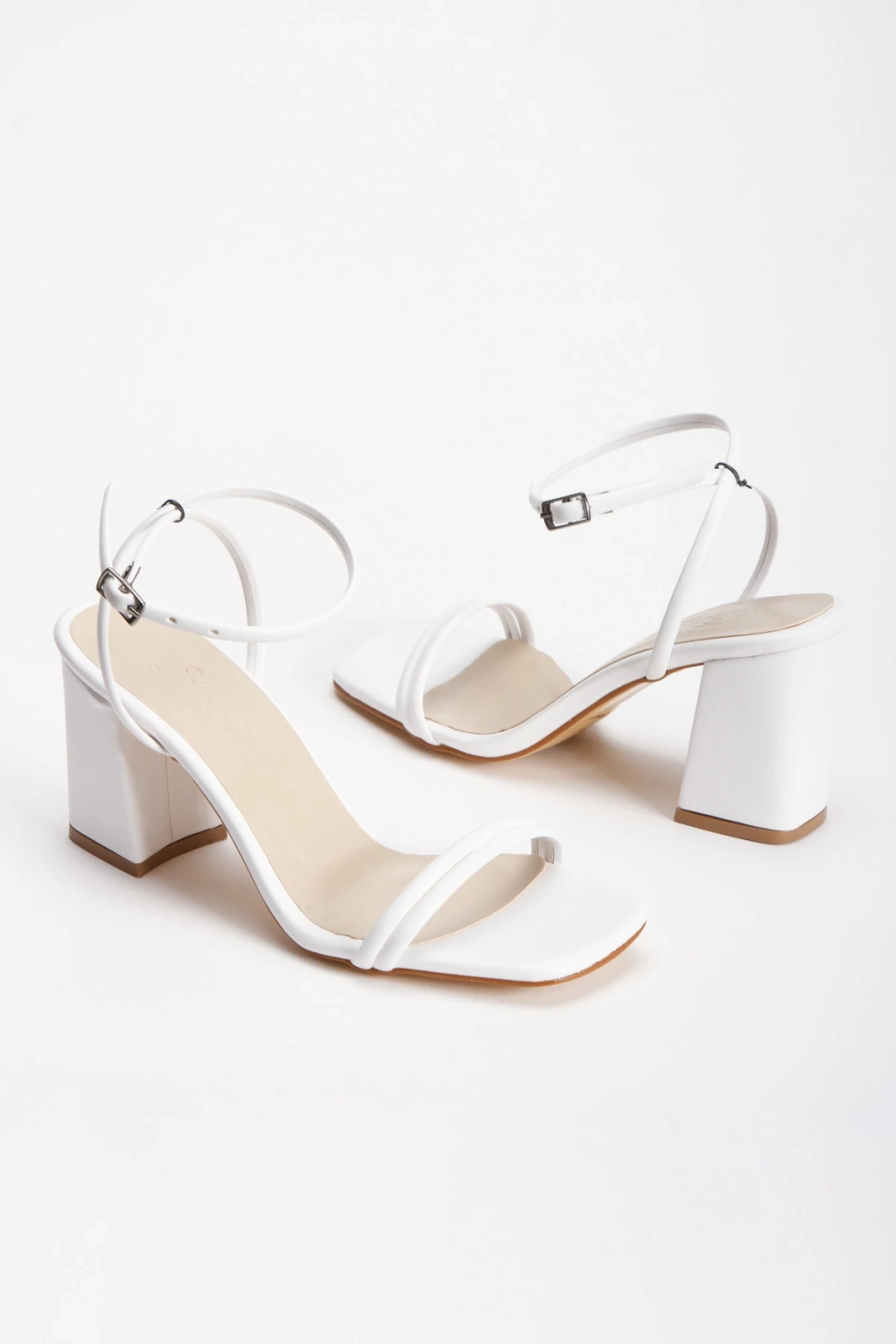 Kadın Beyaz Cilt Çift Bantlı Bilekten Bağlamalı Kalın Topuklu Yazlık Ayakkabı
