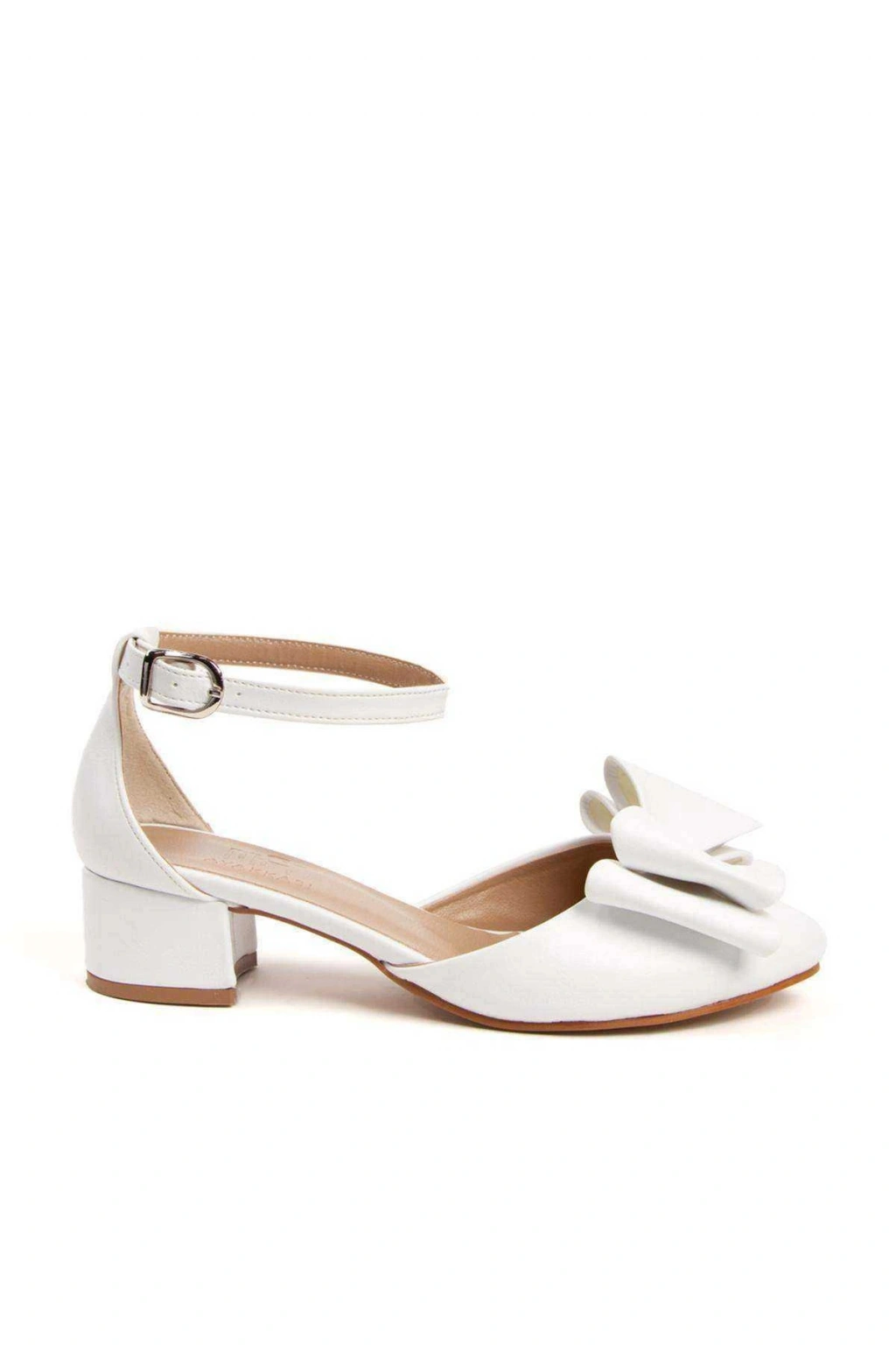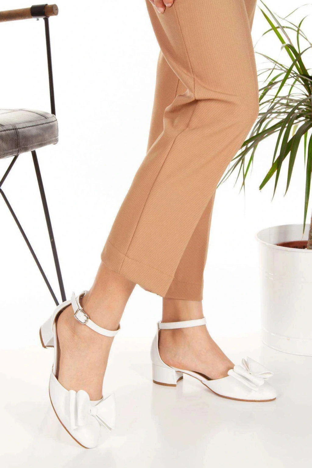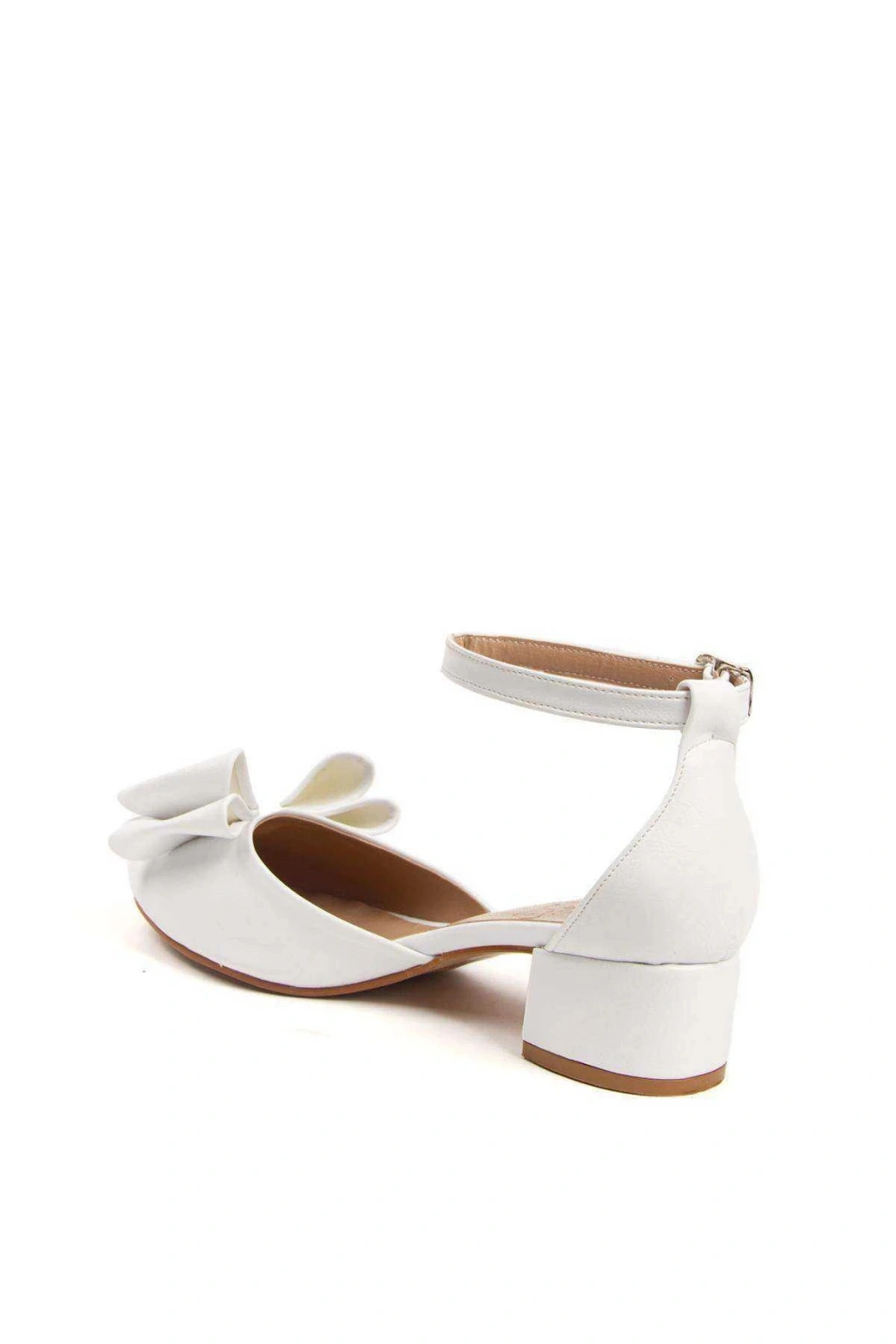 Kadın Beyaz Suni Deri Cilt 3 cm Kısa Kalın Topuklu Şık Fiyonk Detaylı Stiletto Rahat Günlük Stiletto