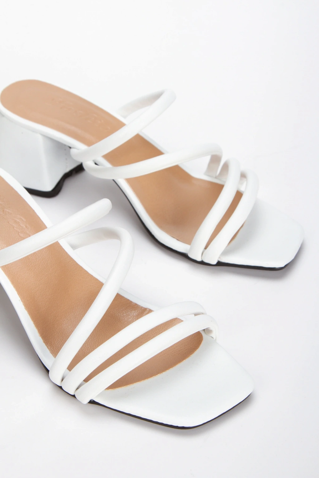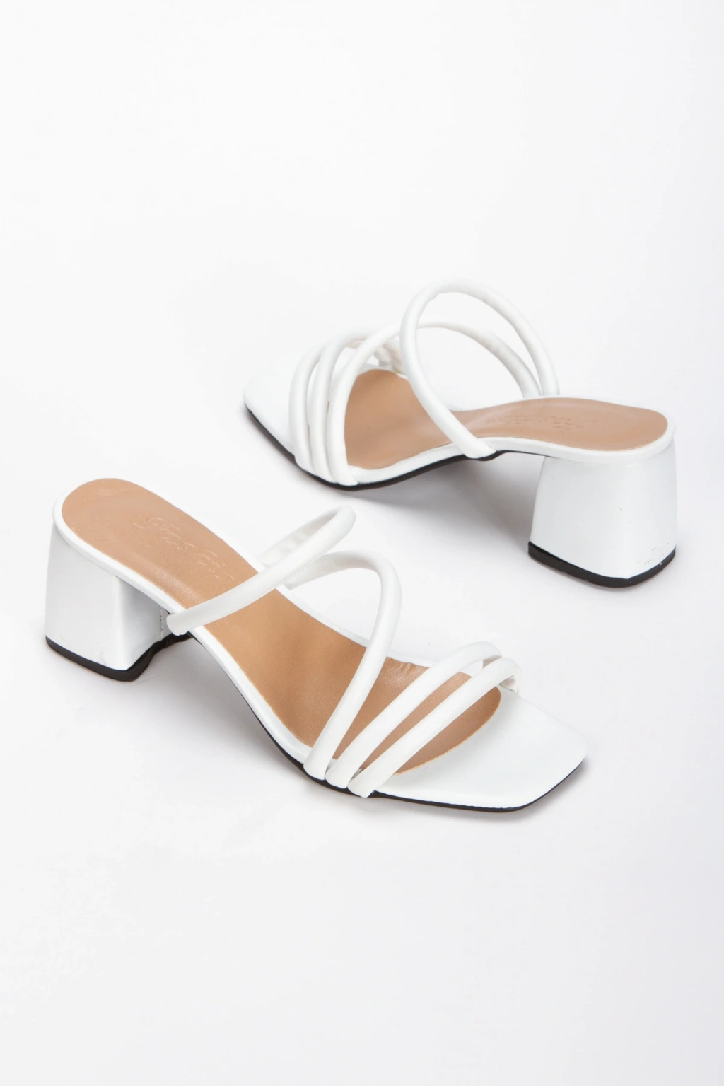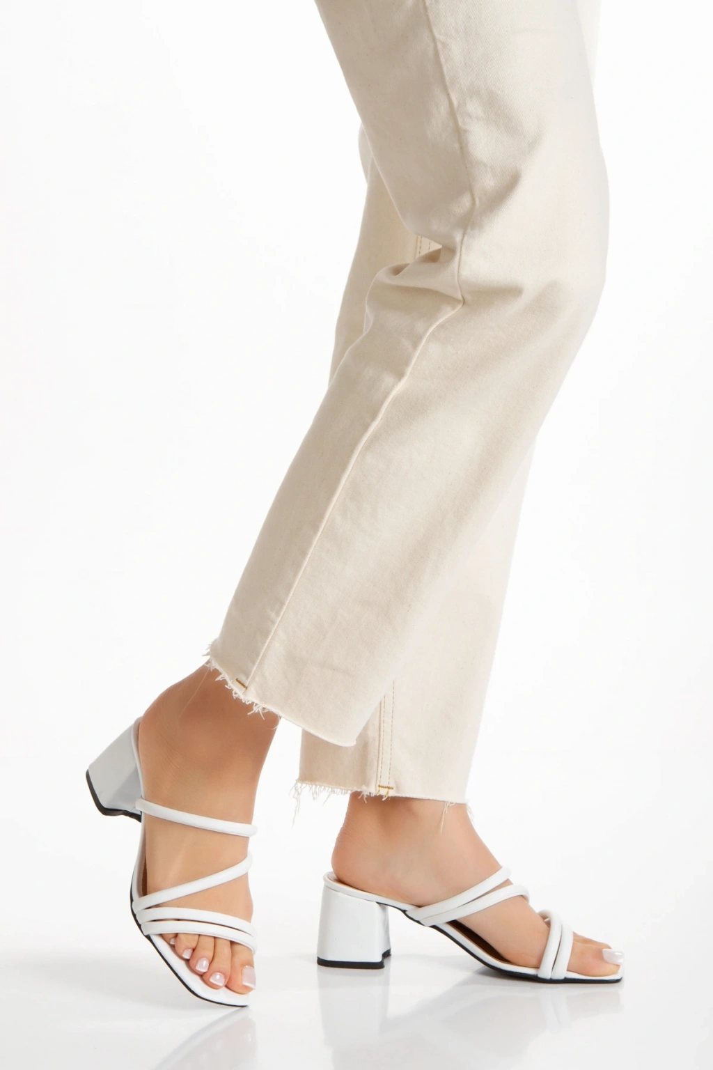 Kadın Beyaz Suni Deri Cilt Kalın Topuklu Şık Biye Detaylı Rahat Terlik