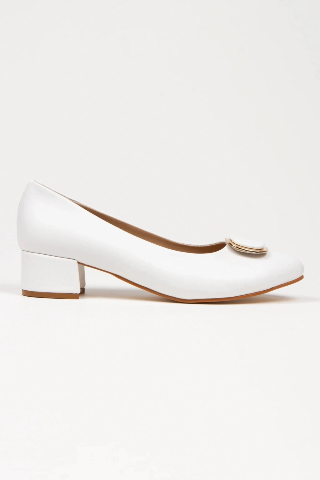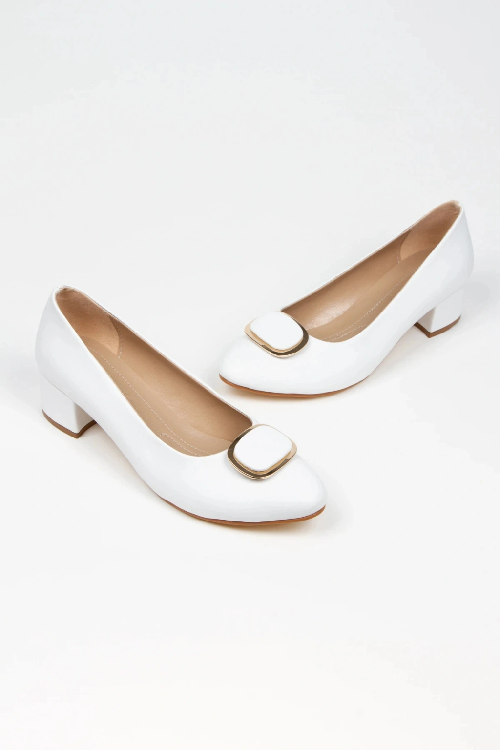 Kadın Beyaz Suni Deri Cilt Stiletto 3 cm Kısa Kalın Topuklu Şık Toka Detaylı Rahat Stiletto