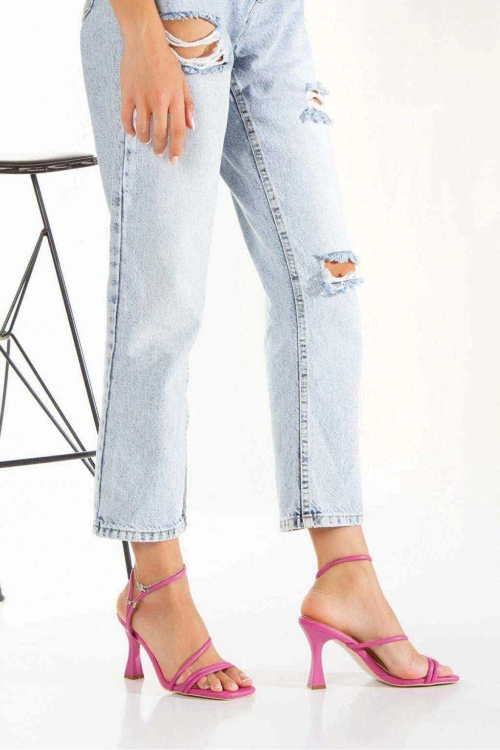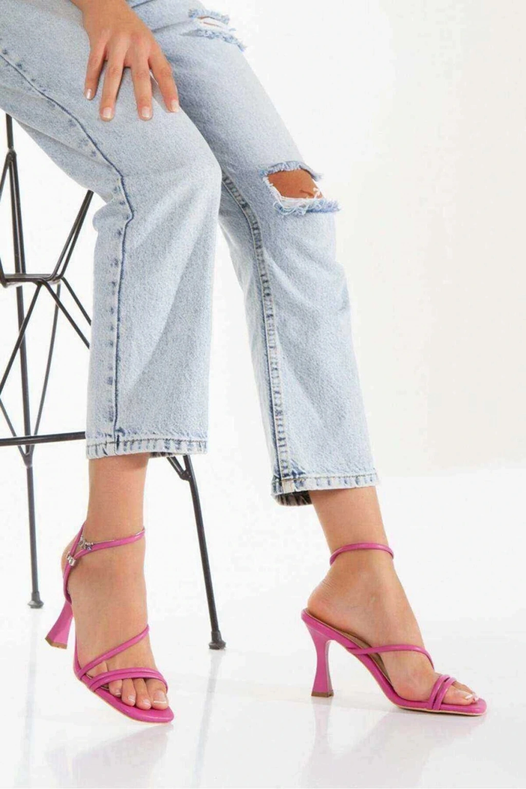 Kadın Fuşya Suni Deri Cilt Kelebek Toka Detaylı Bilekten Ayarlamalı Kadeh Topuklu Ayakkabı