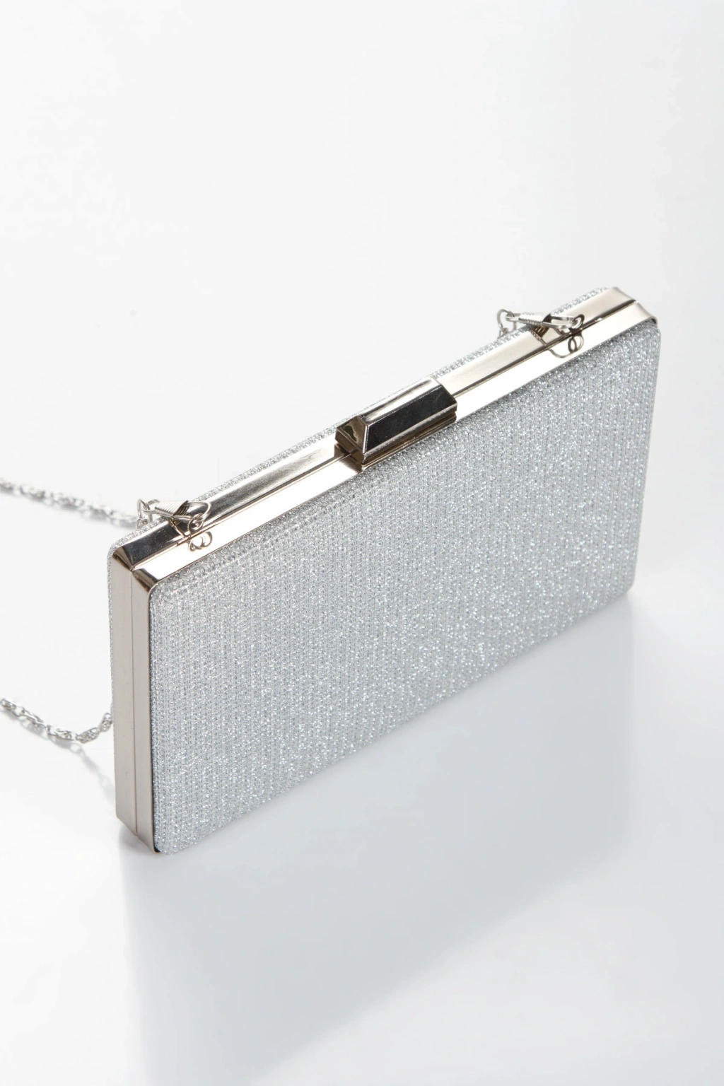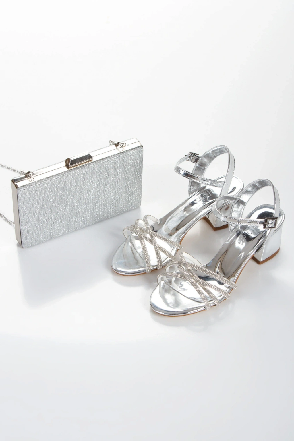 Kadın Gümüş Abiye Parlak Damla Taşlı Baklava Desenli Şık Ayakkabı ve Çanta Kombini