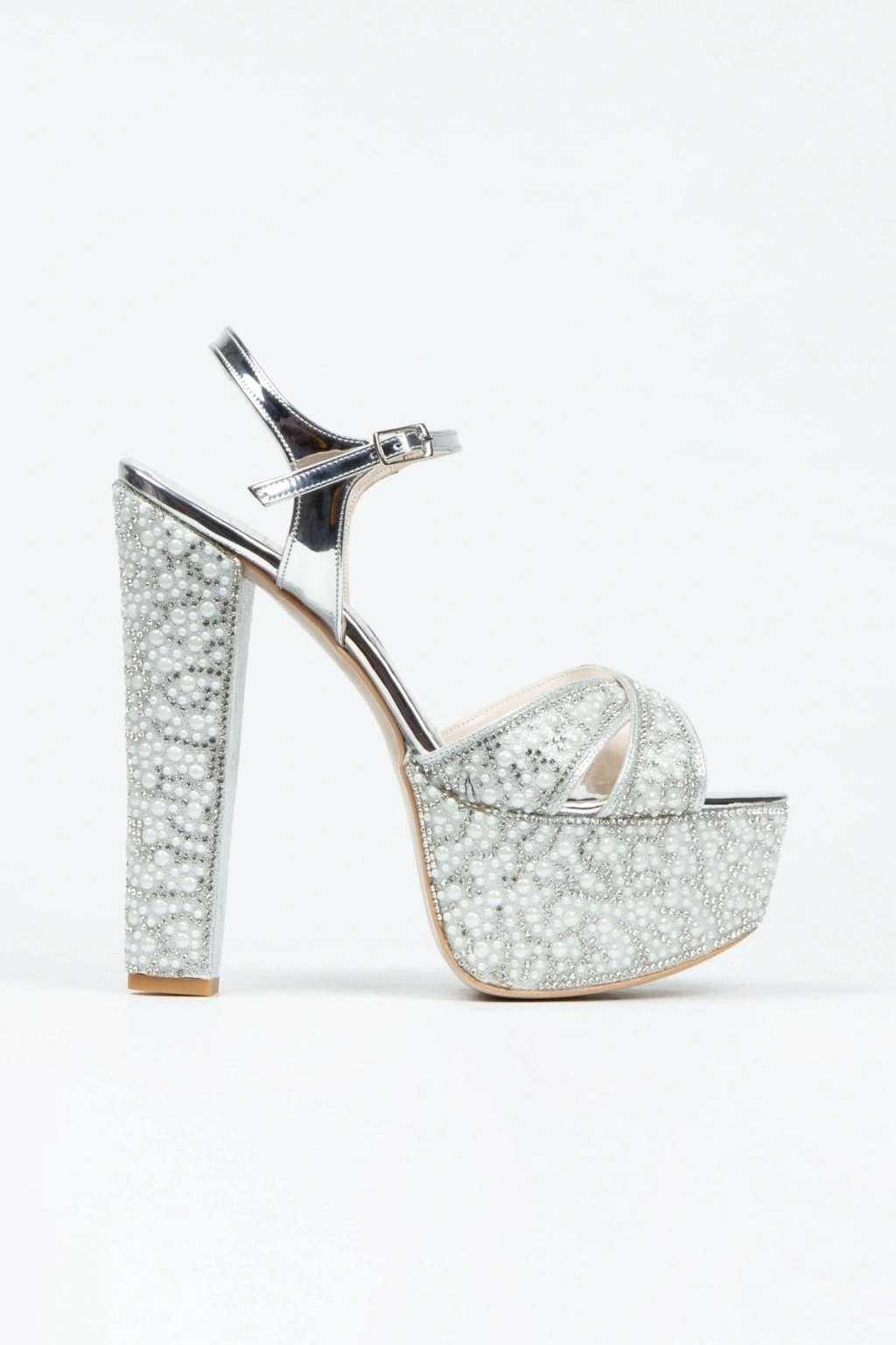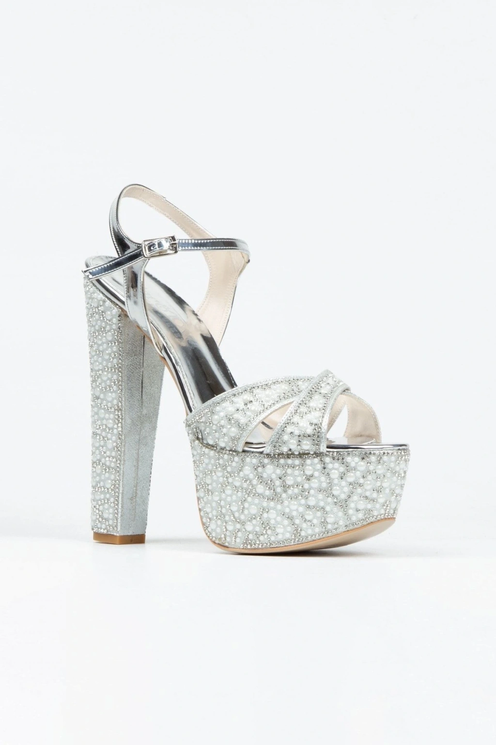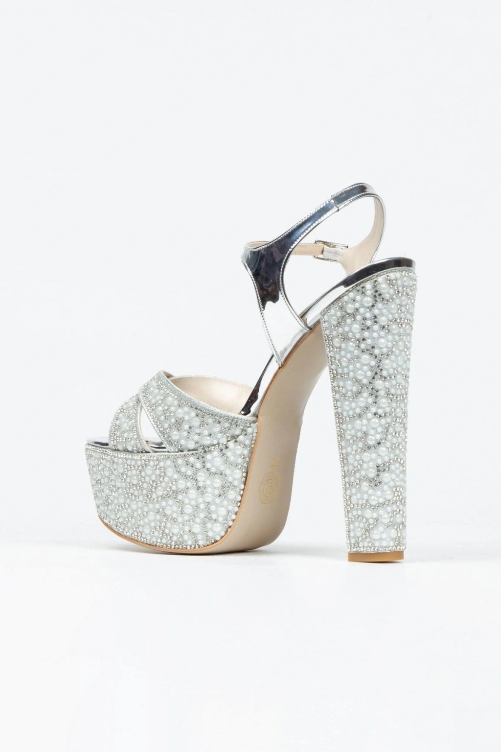 Kadın Gümüş İnci Taşlı Yüksek Platform Arkası Açık Kalın Topuklu Rahat ve Şık Abiye Ayakkabı