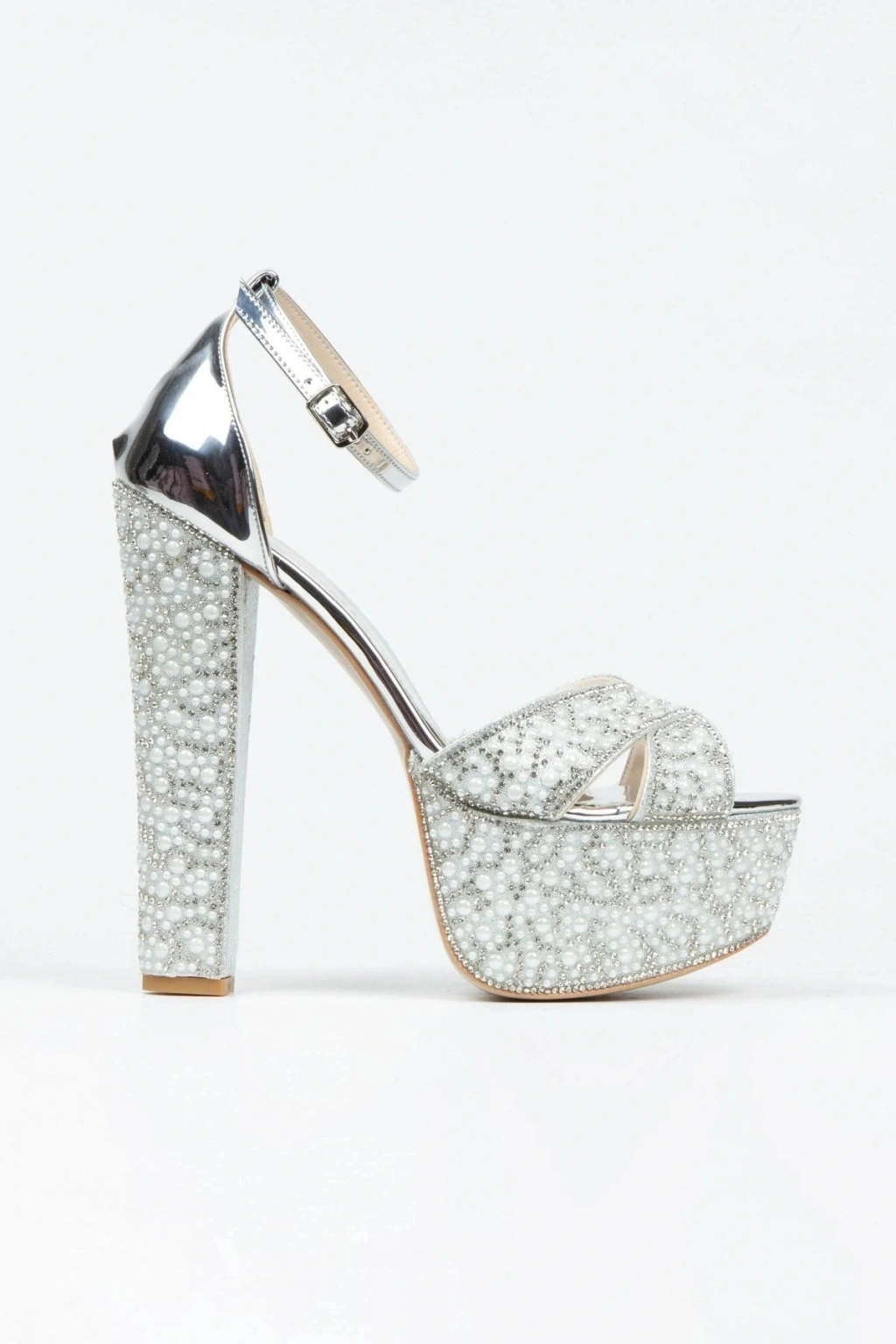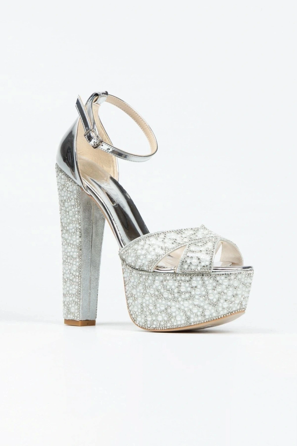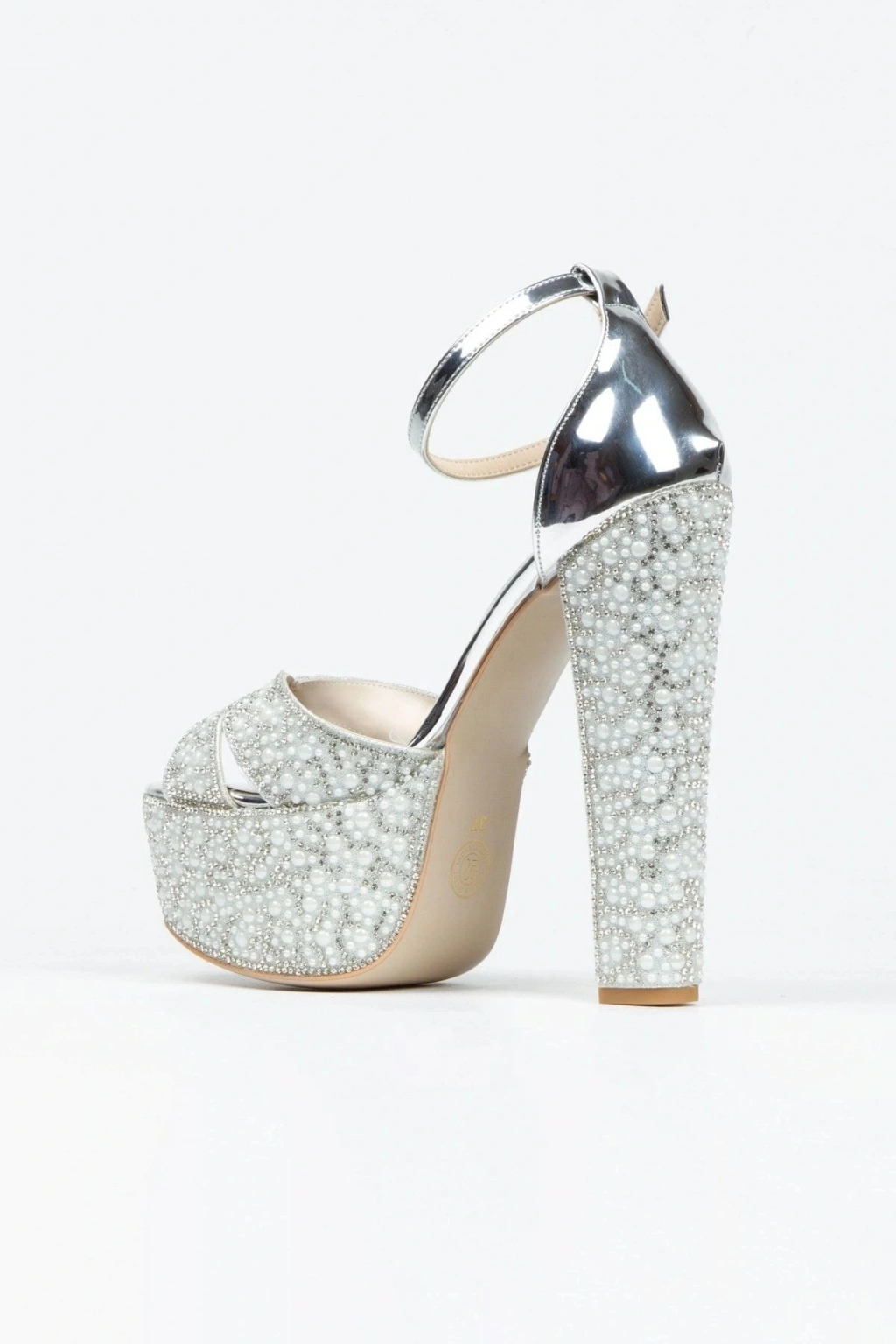 Kadın Gümüş İnci Taşlı Yüksek Platform Arkası Kapalı Kalın Topuklu Rahat ve Şık Abiye Ayakkabı