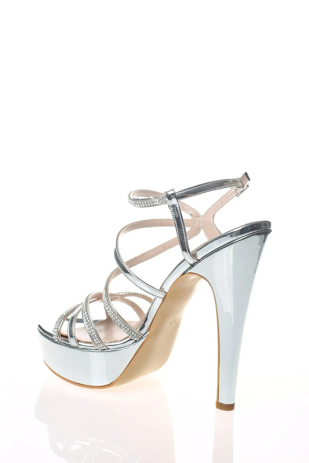 Kadın Gümüş Rugan Yüksek Platform İnce Topuklu Şık Taş Detaylı Abiye Ayakkabı