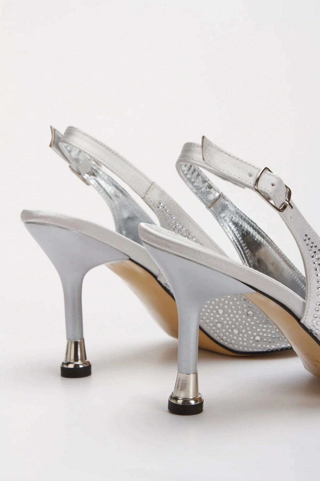 Kadın Gümüş Saten Damla Taşlarla Bezenmiş 8 cm İnce Galvaniz Topuklu Rahat Stiletto