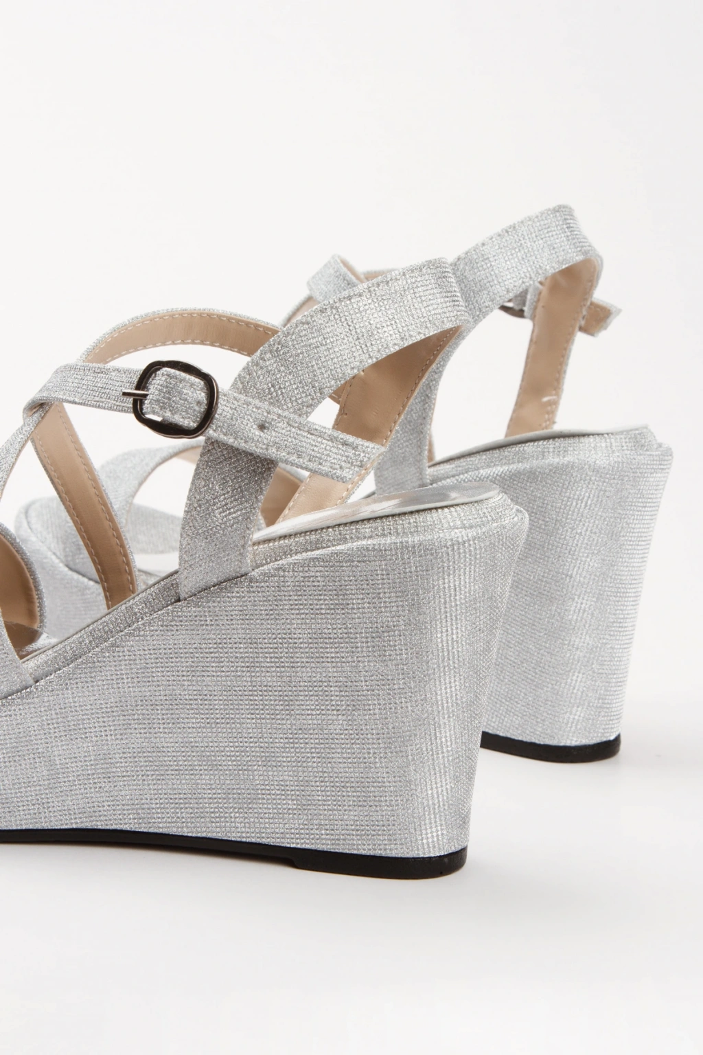 Kadın Gümüş Simli Arka Açık Şık Çapraz Bantlı Dolgu Tabanlı Yazlık Ayakkabı