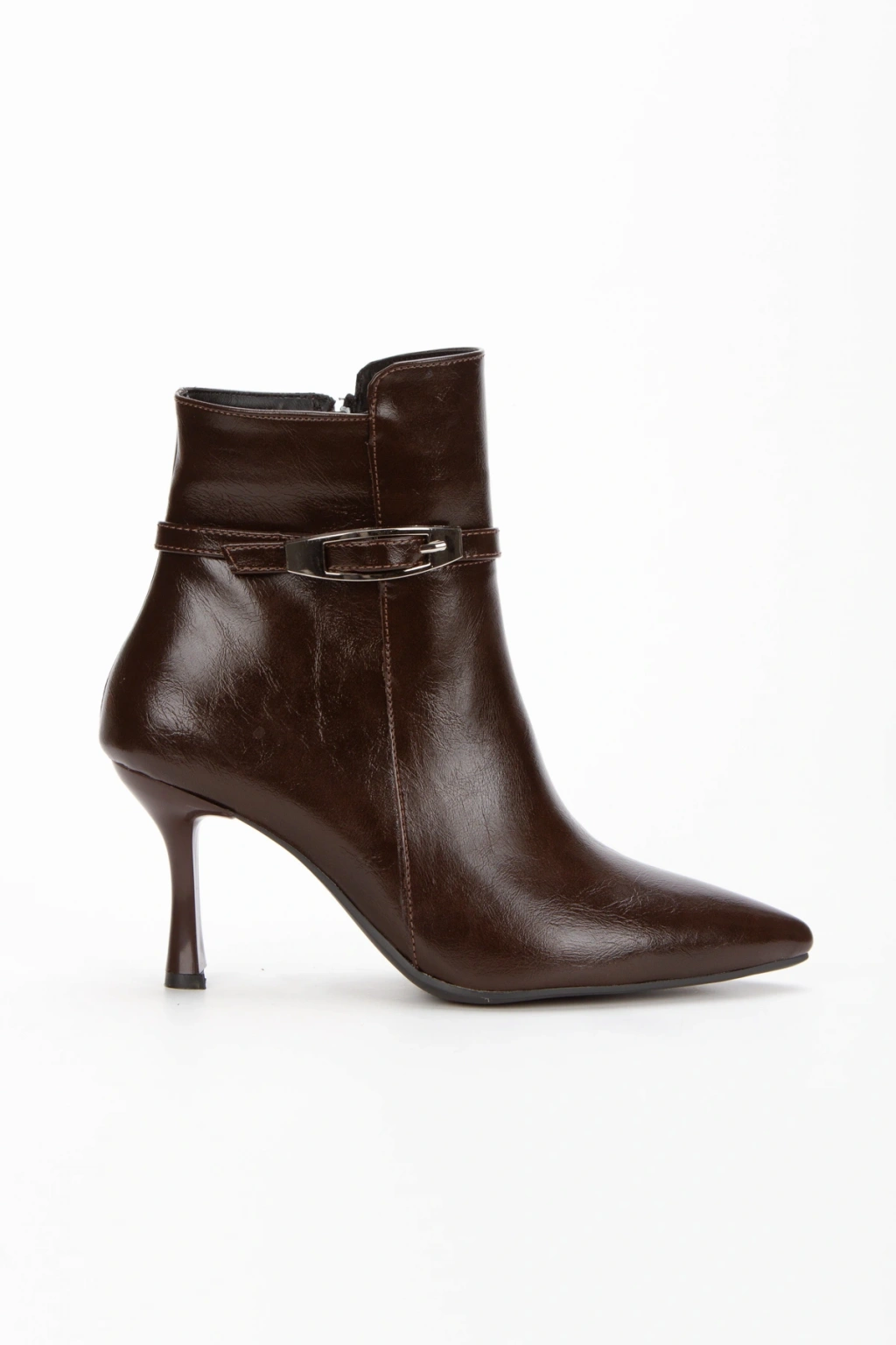 Kadın Kahverengi Sivri Burunlu İnce Topuklu Rahat Şık Toka Detaylı Bot