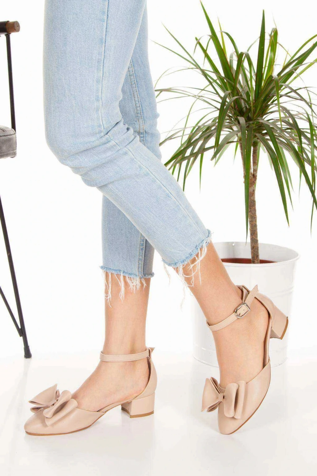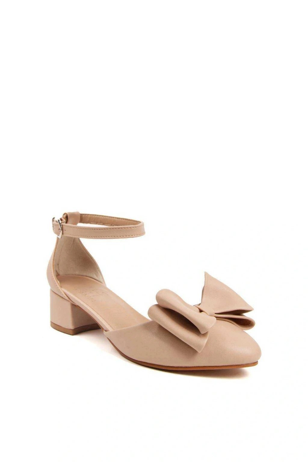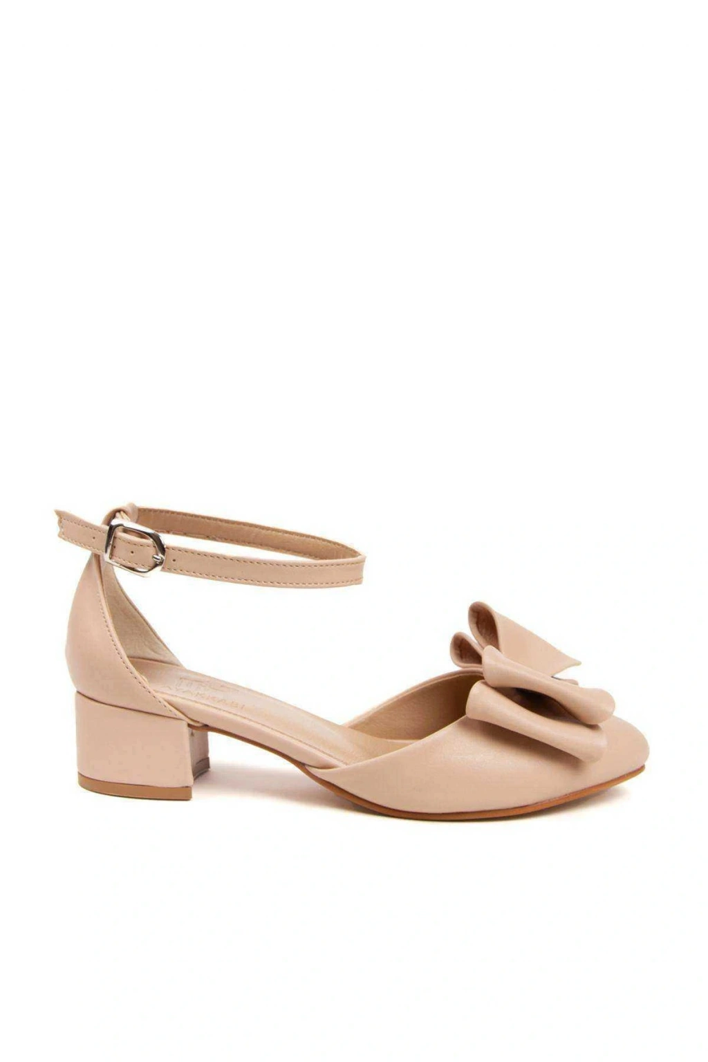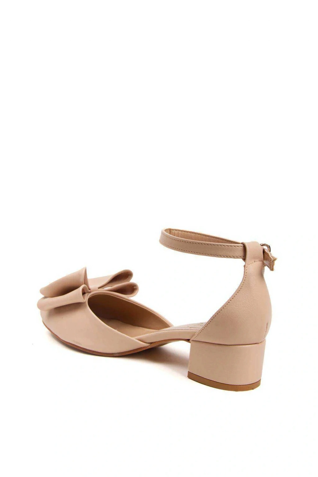 Kadın Nude (EKRU) Suni Deri Cilt 3 Cm Kısa Kalın Topuklu Şık Fiyonk Detaylı Stiletto Rahat Günlük