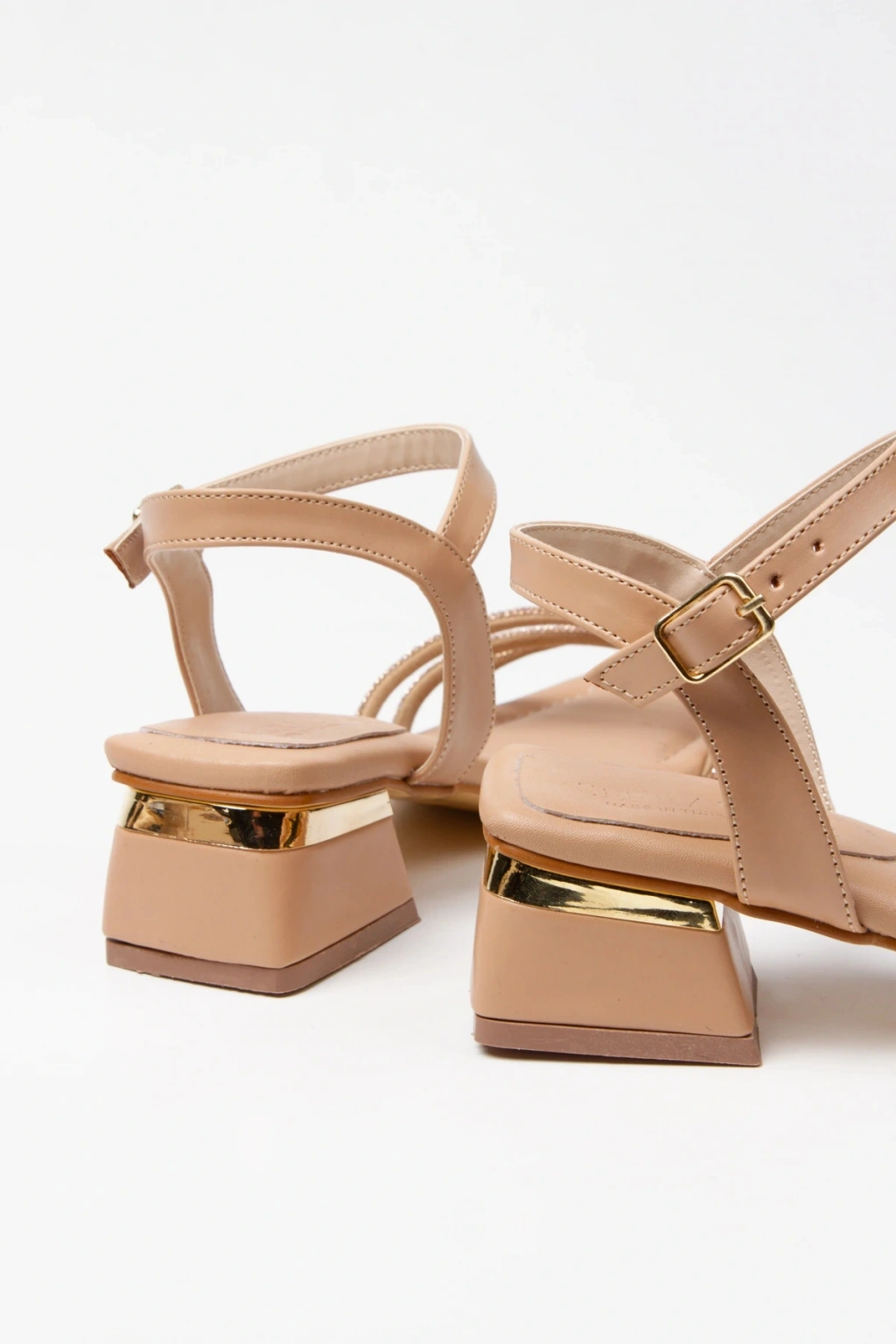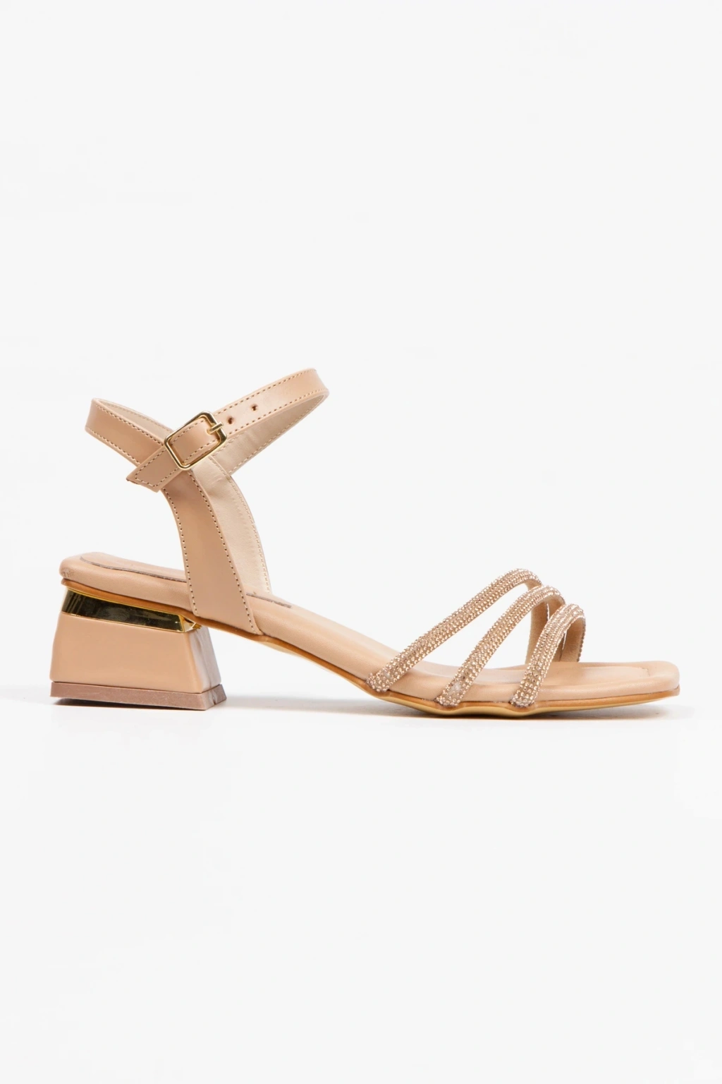 Kadın Nude Suni Deri Cilt 3 Sıralı Taşlı Galvaniz Kalın Topuklu Şık Abiye Ayakkabı