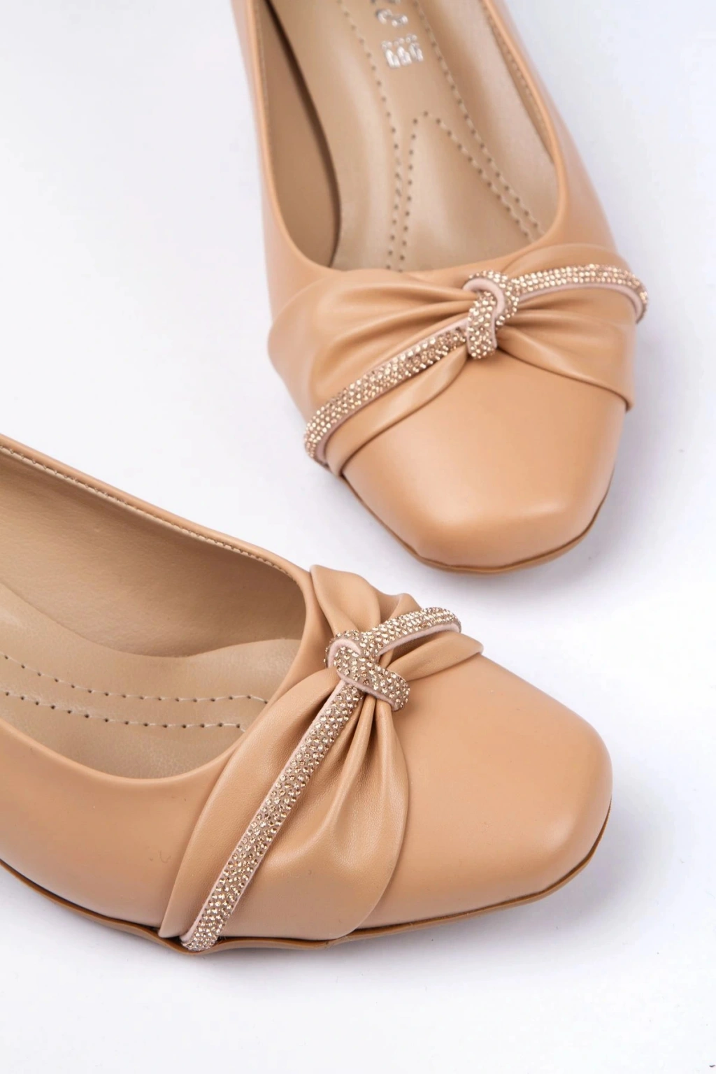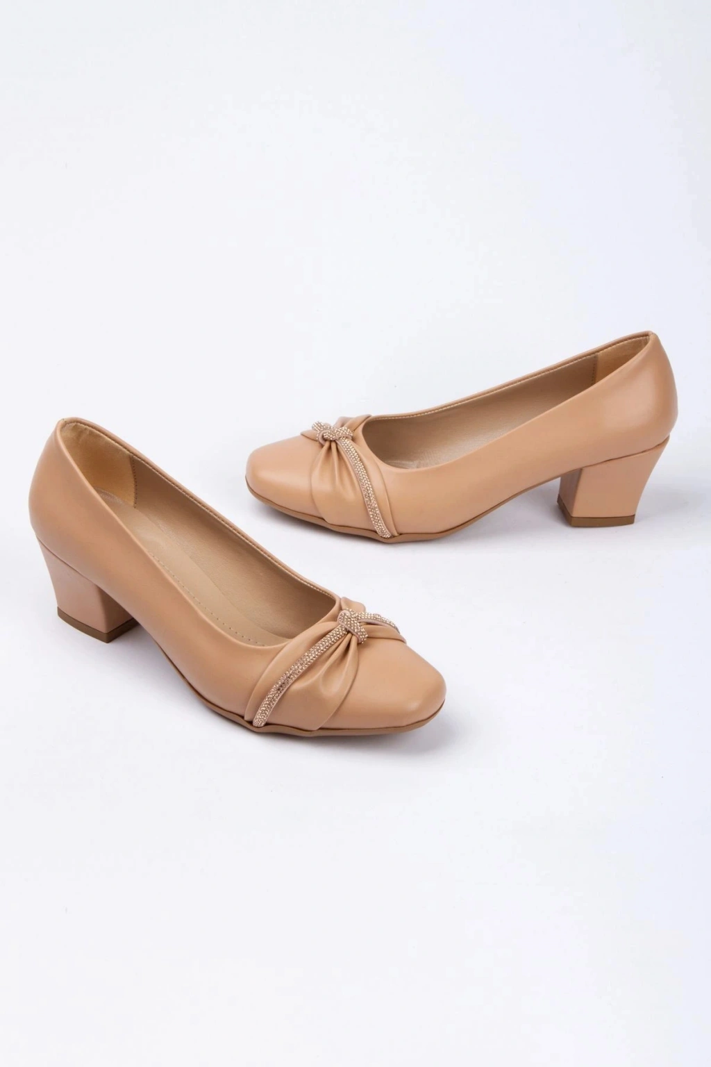 Kadın Nude Suni Deri Cilt Kısa Kalın Topuklu Fiyonk ve Taş Detaylı Ortopedik Tabanlı Rahat Stiletto