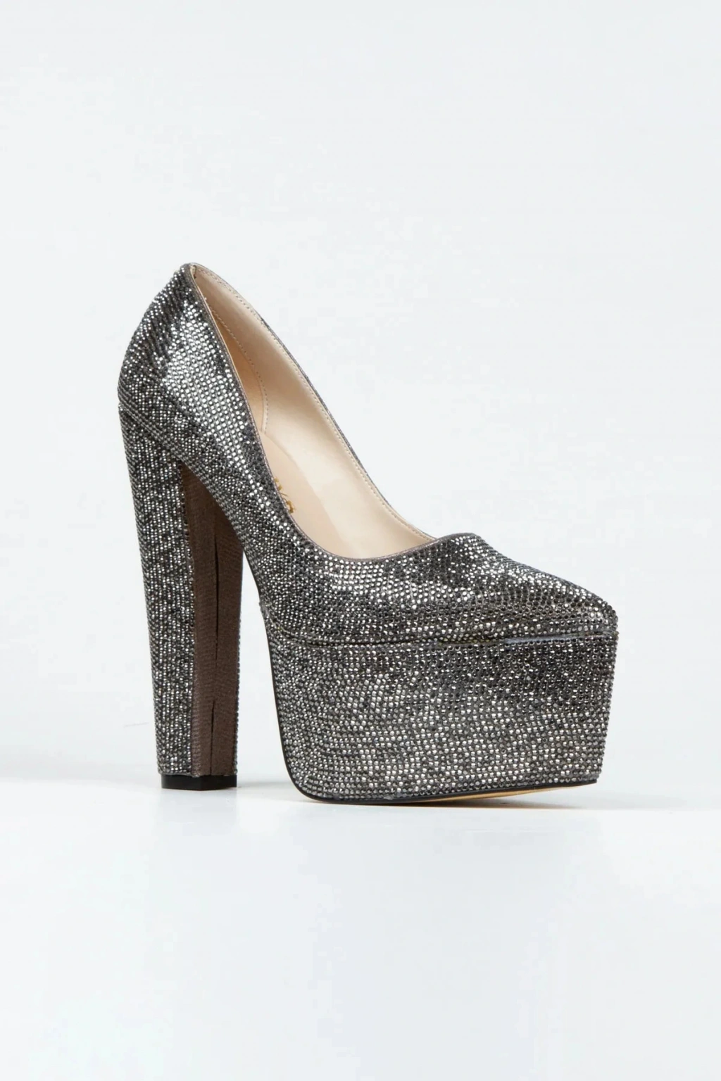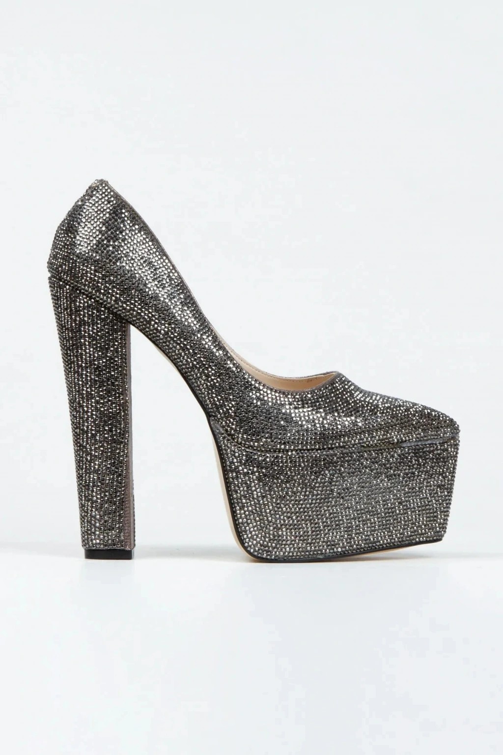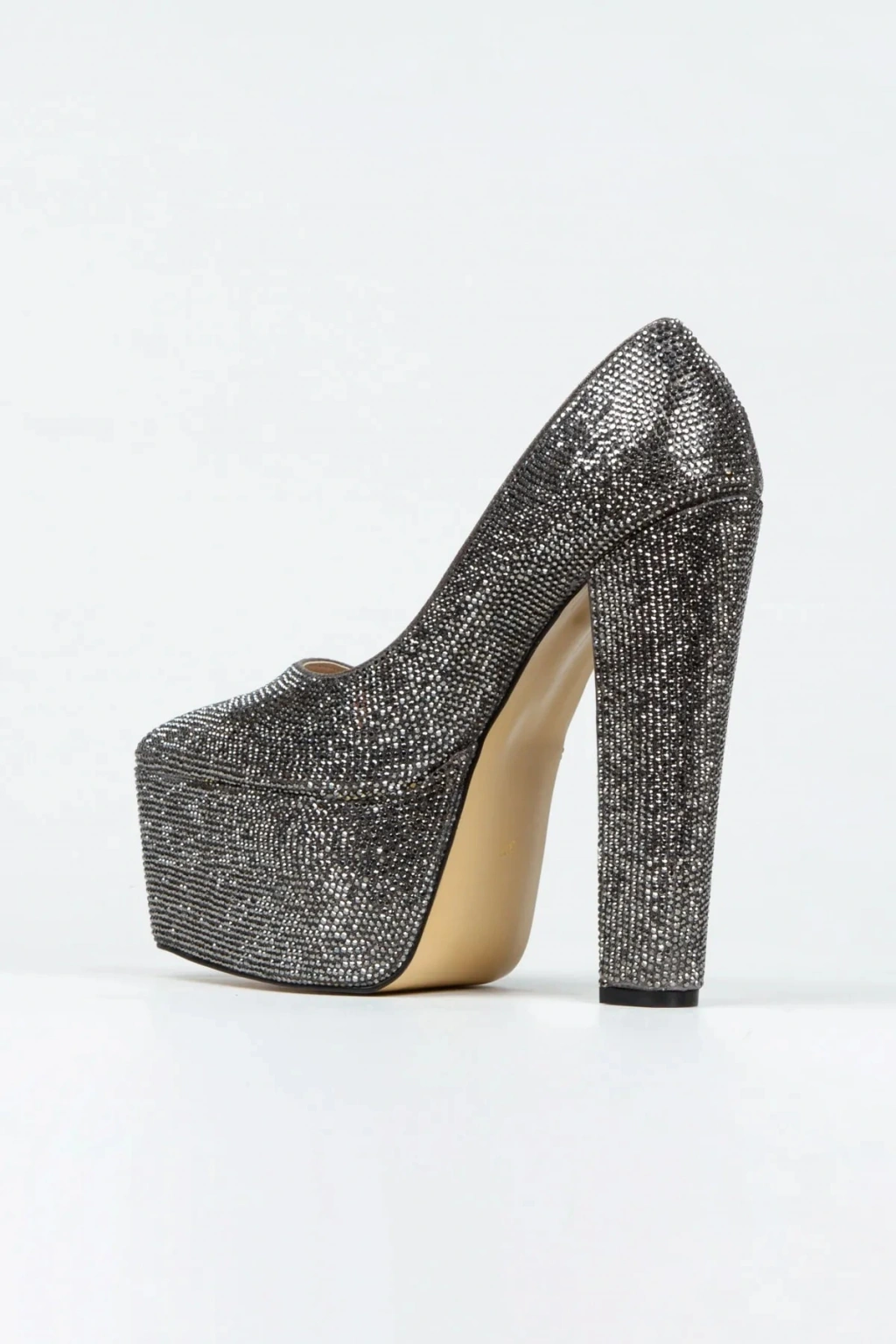 Kadın Platin Komple Taşlarla Bezenmiş Yüksek Platform Kapalı Burunlu Kalın Topuklu Şık Ayakkabı