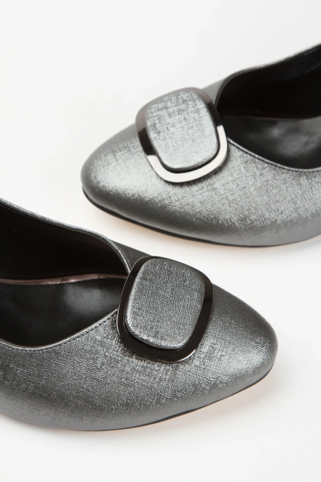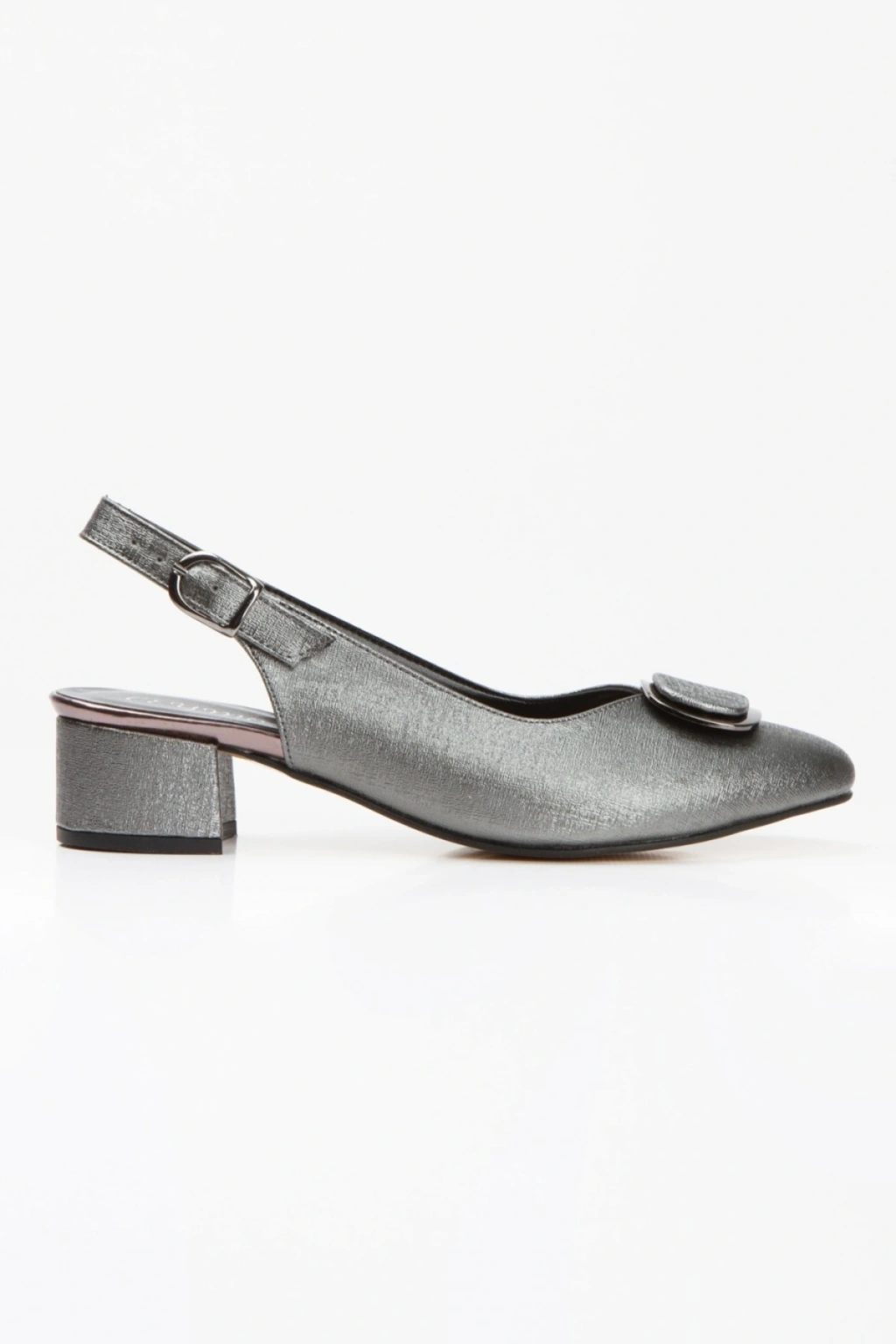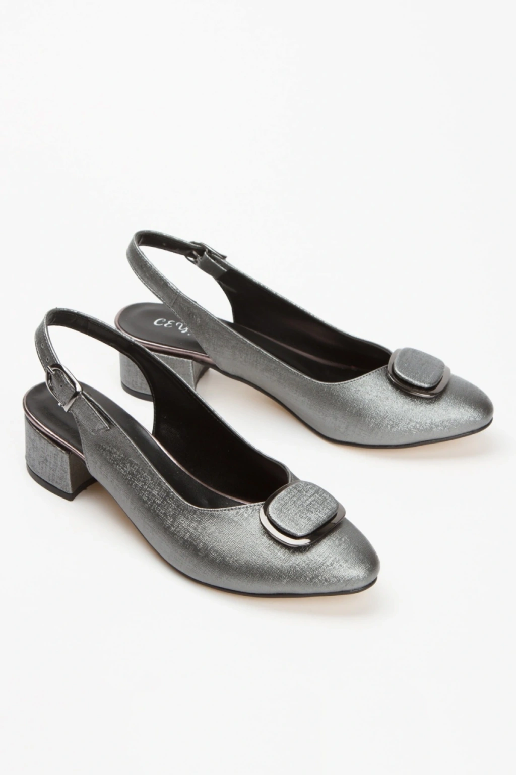 Kadın Platin Parıltılı Arkası Açık Kısa Kalın Topuklu Şık Toka Detaylı ve Rahat Stiletto