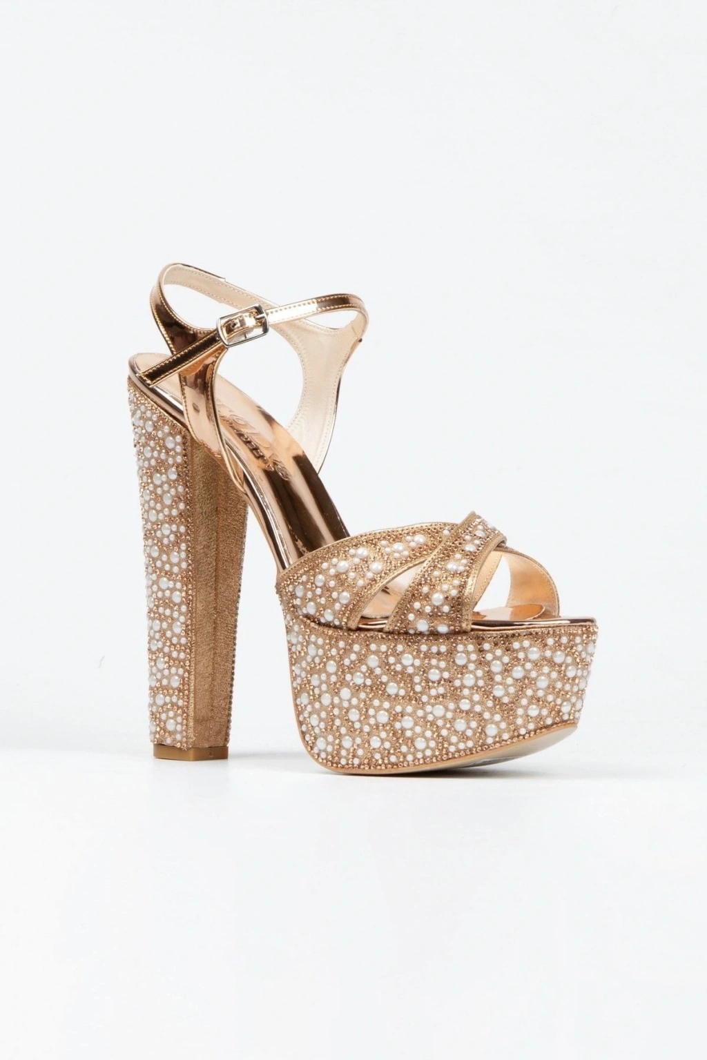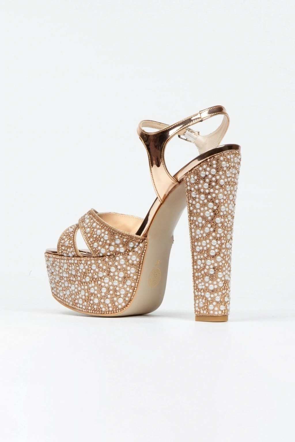 Kadın Rose İnci Taşlı Yüksek Platform Arkası Açık Kalın Topuklu Rahat ve Şık Abiye Ayakkabı