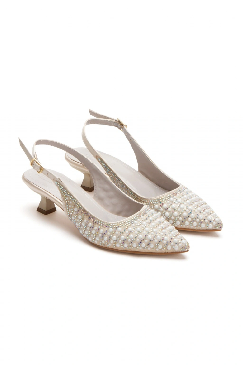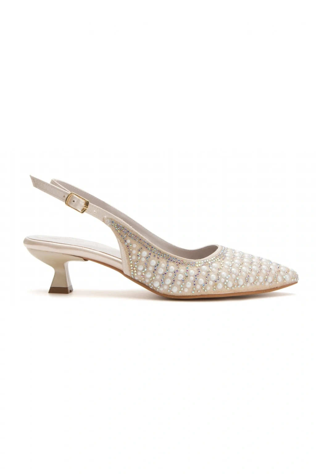 Kadın Altın İnci Damla Taşlarla Bezenmiş İnce Kısa Topuklu Rahat Stiletto