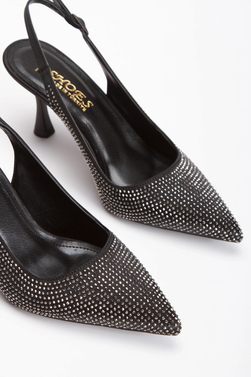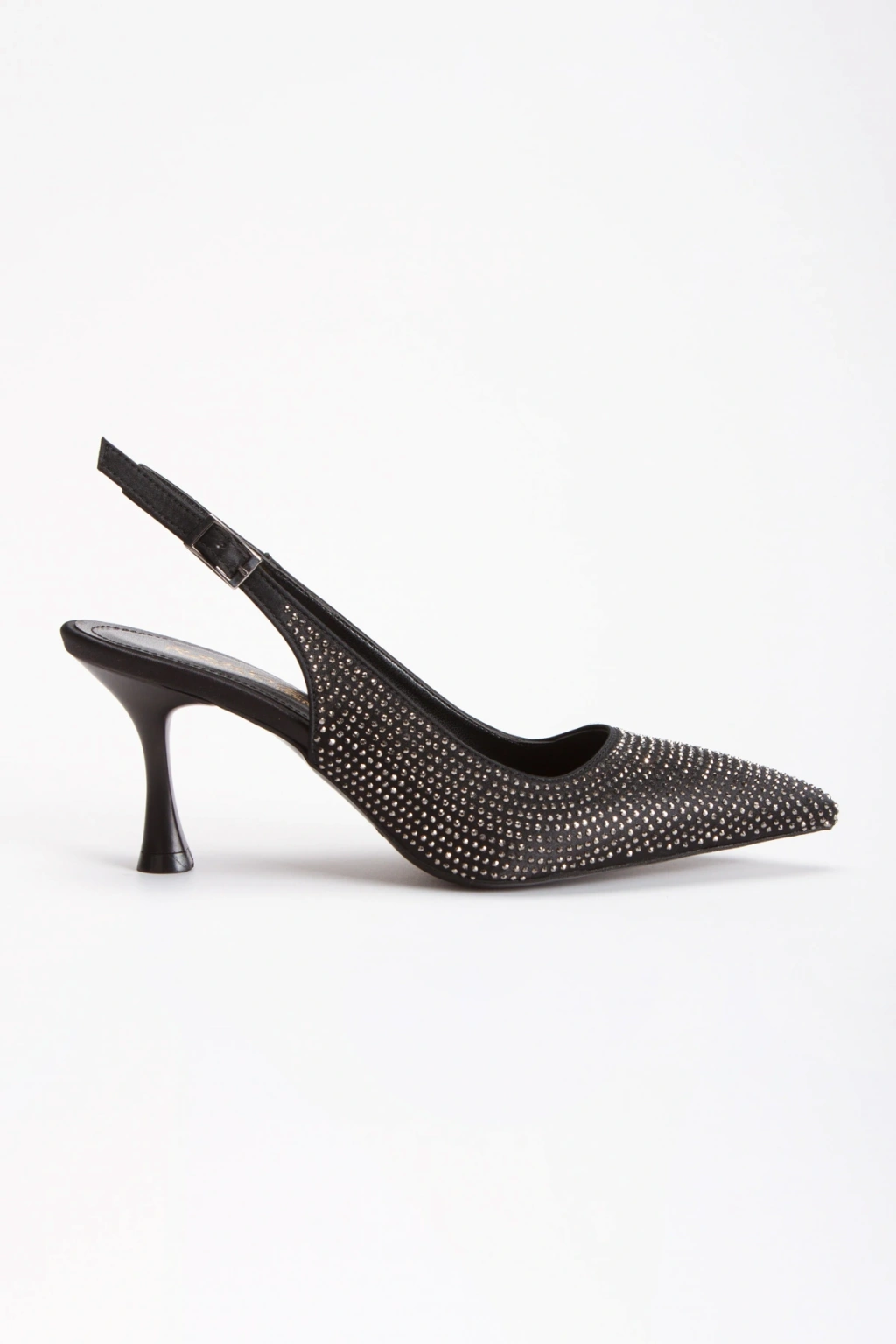 Kadın Siyah 7 cm İnce Topuklu Şık Damla Taşlarla Bezenmiş Rahat Stiletto