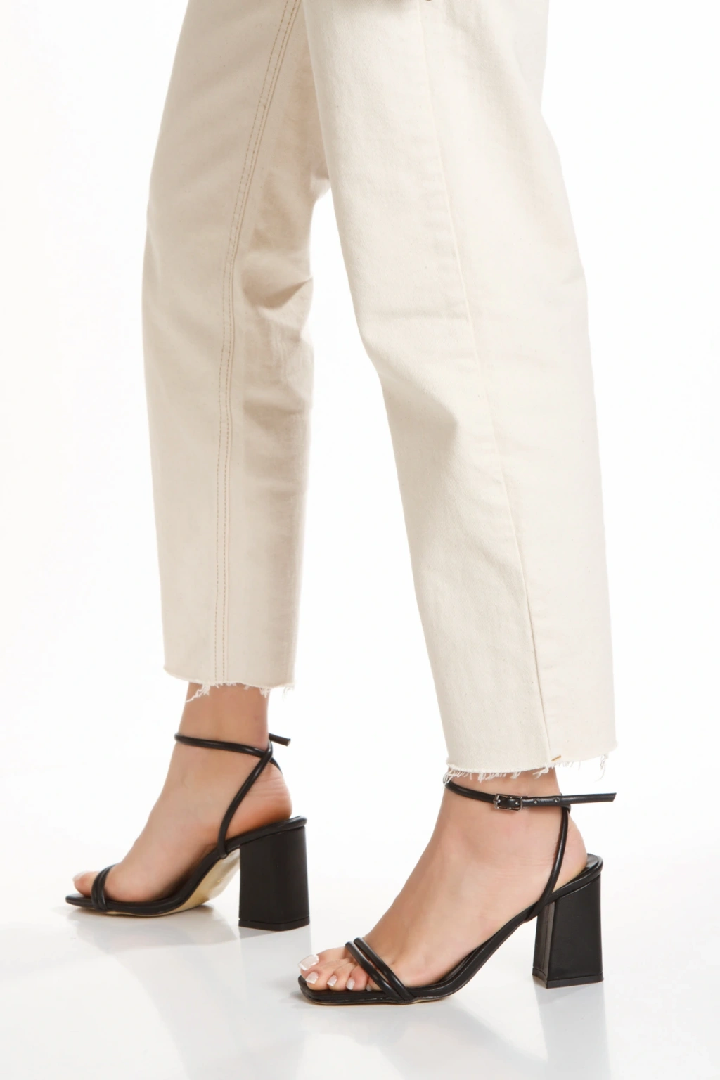 Kadın Beyaz Cilt Çift Bantlı Bilekten Bağlamalı Kalın Topuklu Yazlık Ayakkabı