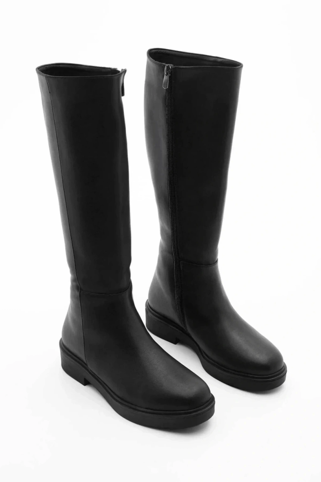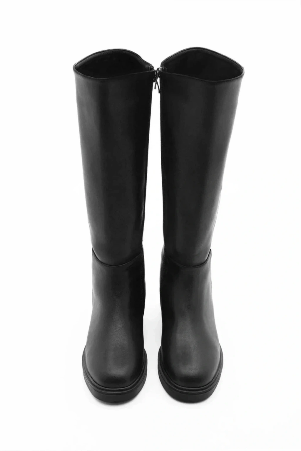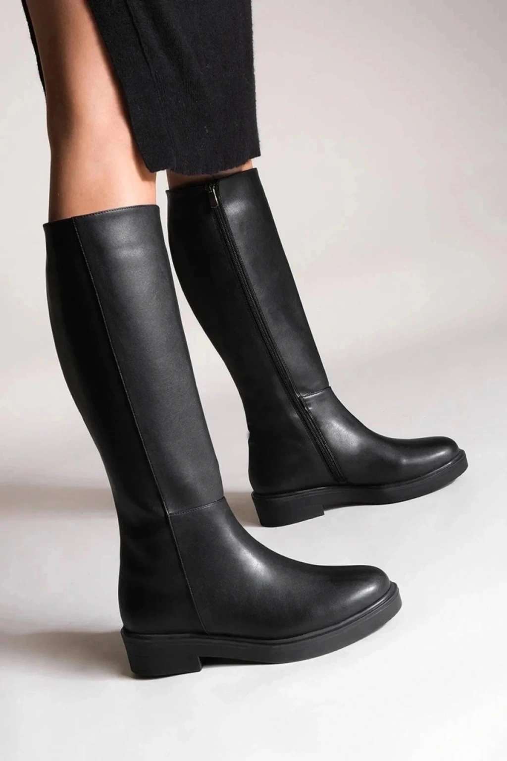 Kadın Siyah Cilt Dekolte Düz Topuklu Fermuarlı Rahat Çizme