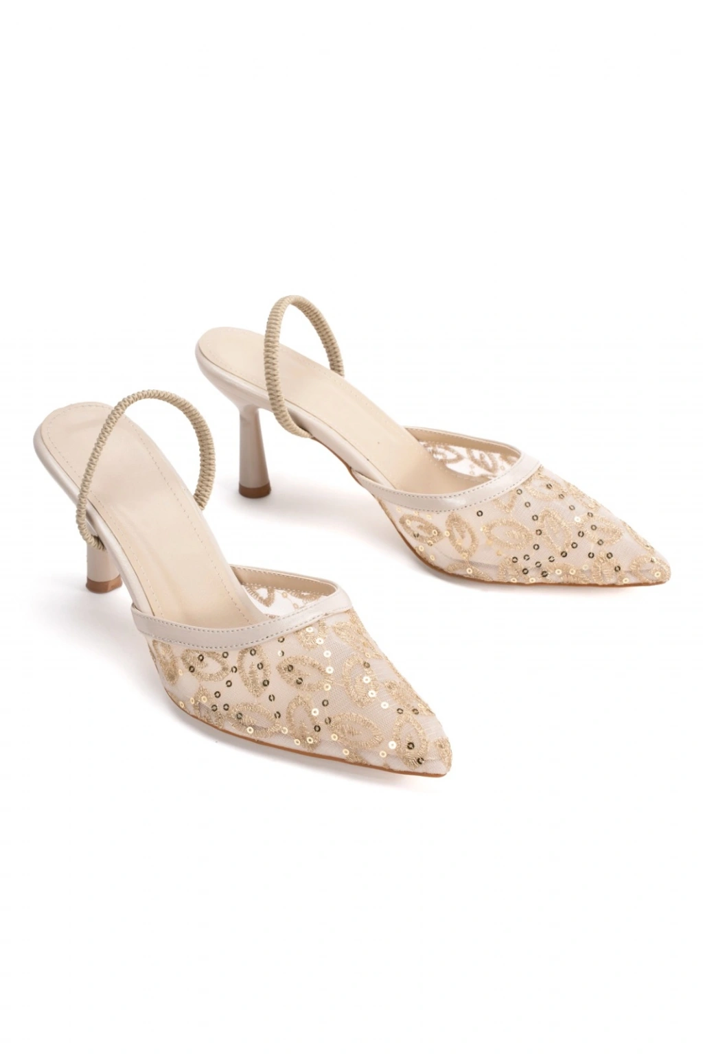 Kadın Altın İnce Topuklu Sivri Burunlu Fileli Arkası Lastikli Şık Abiye Stiletto