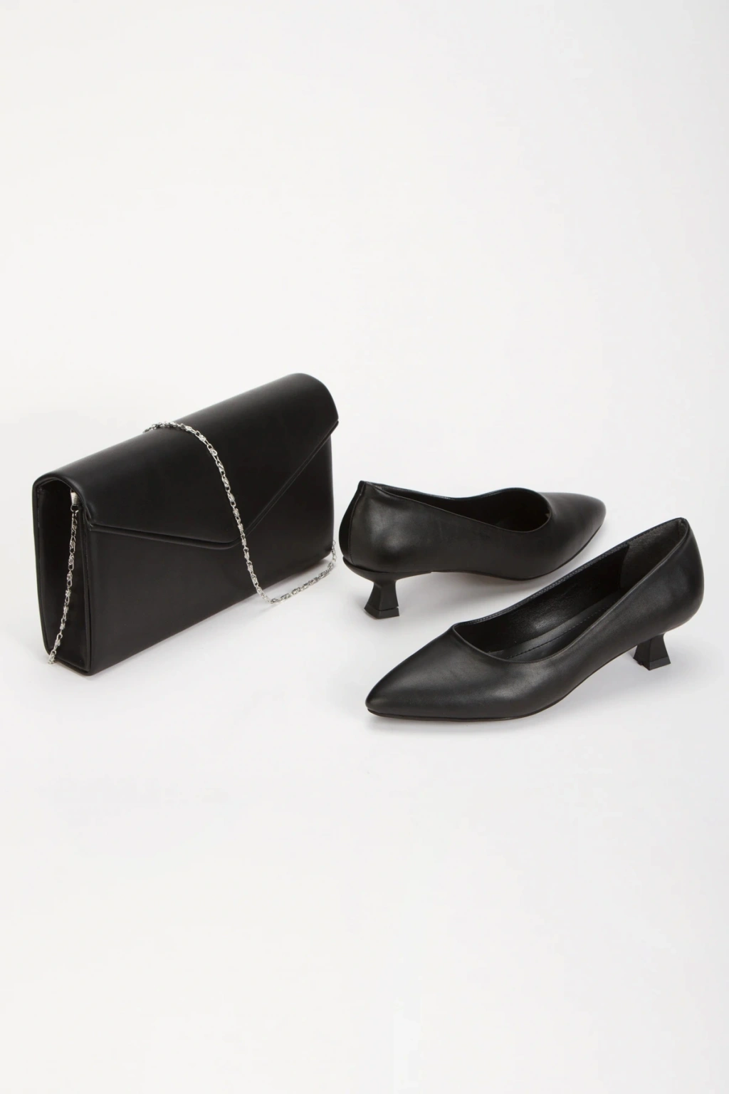 Kadın Siyah Kısa Kadeh Topuklu  Rahat Şık Stiletto ve Çanta Kombini