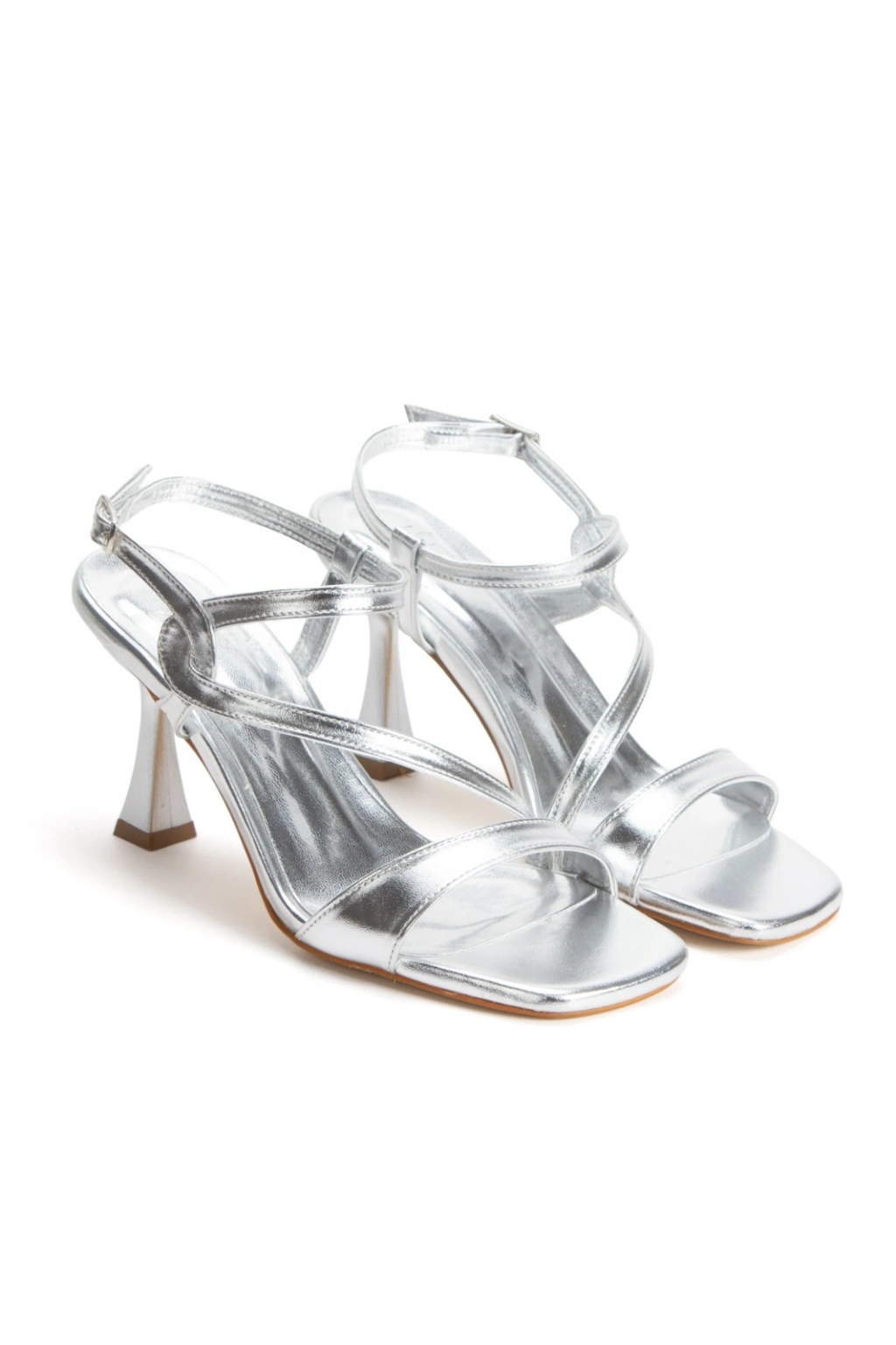 Kadın Gümüş Metalik Tek Bantlı Biye Yılan Detaylı Abiye Ayakkabı