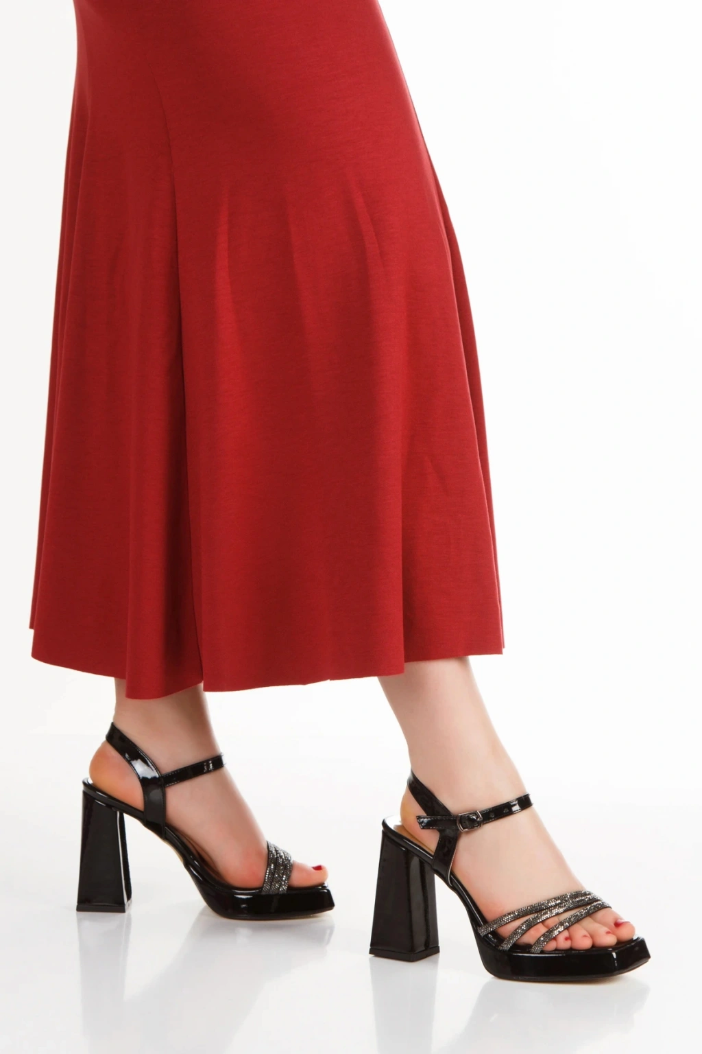 Kadın Siyah Rugan 3 Sıralı Taşlı Yüksek Platform ve Kalın Topuklu Rahat Şık Abiye Ayakkabı