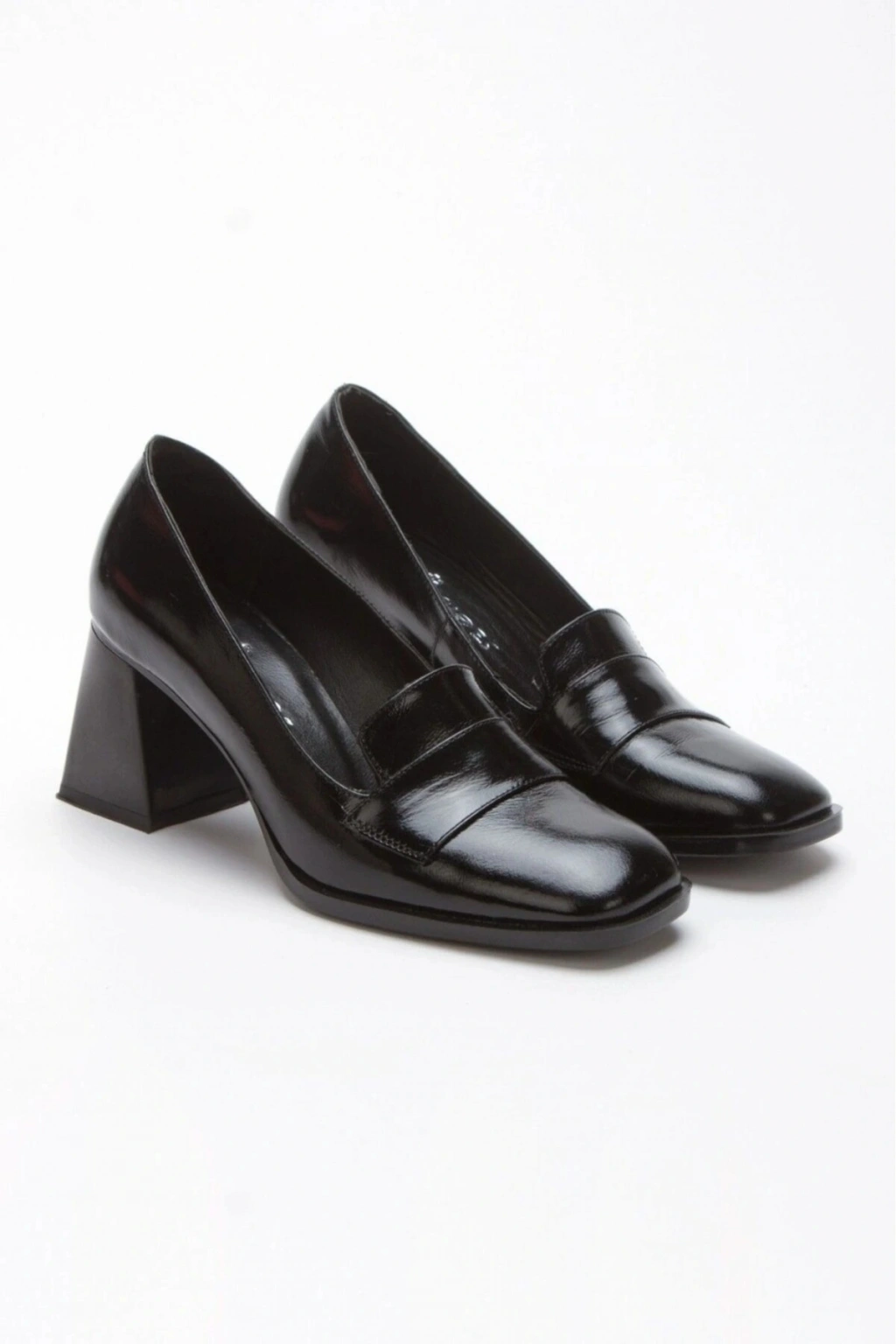 Kadın Siyah Rugan Hakiki Deri Loafer Yeni Tarz Küt Burunlu Hafif ve Yüksek Topuklu Rahat Ayakkabı