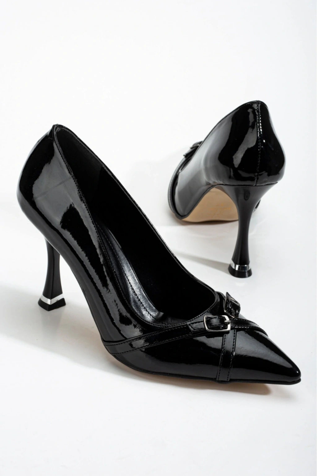 Kadın Siyah Rugan Şık Tarz Topuklu Çift Toka Detaylı Rahat Stiletto